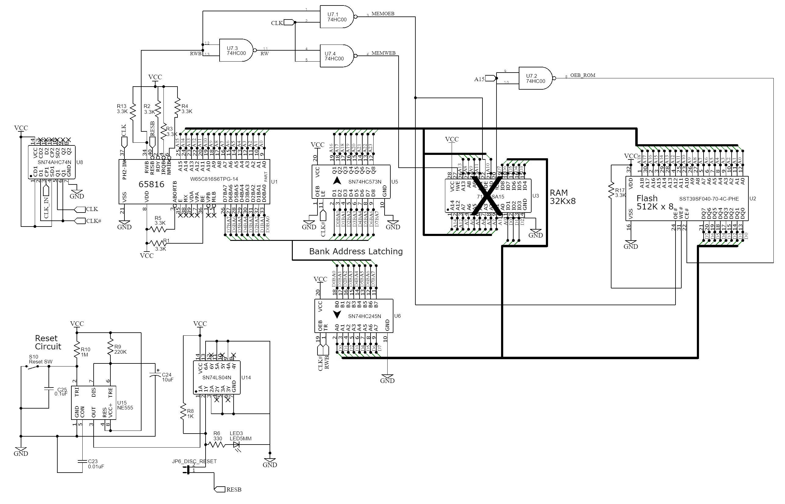 If it's tri-stated, wouldn't it be so something else can drive it? I keep looking over the topic, thinking there's something I'm missing; but in rehsd's schematic, BE's only connection is a pull-up. Otherwise, how fast do you want it? Pull-ups tend to not be useful at the higher 65xx speeds if you want fractional-cycle timing. Consider a line with 30pF total, including the ICs it's connected to, IC sockets, capacitance in the board, etc., and a pull-up of 10K which I'm seeing on plasmo's .pdf of rehsd's schematic. That makes for a time constant of 330ns. (Time constant is the length of time needed to achieve (1-1/e)*total_voltage_swing, or about 63% of the voltage swing. So for 5V CMOS it would be the time required to go from 0V to 3.16V.) You may need more logic to make sure its input swings as fast as you want it to.