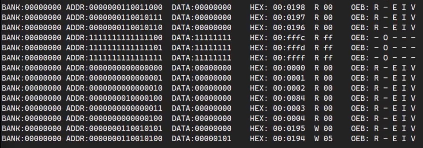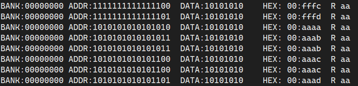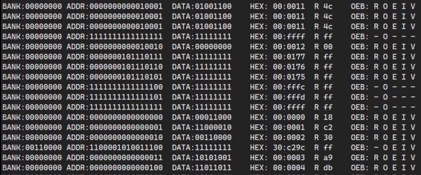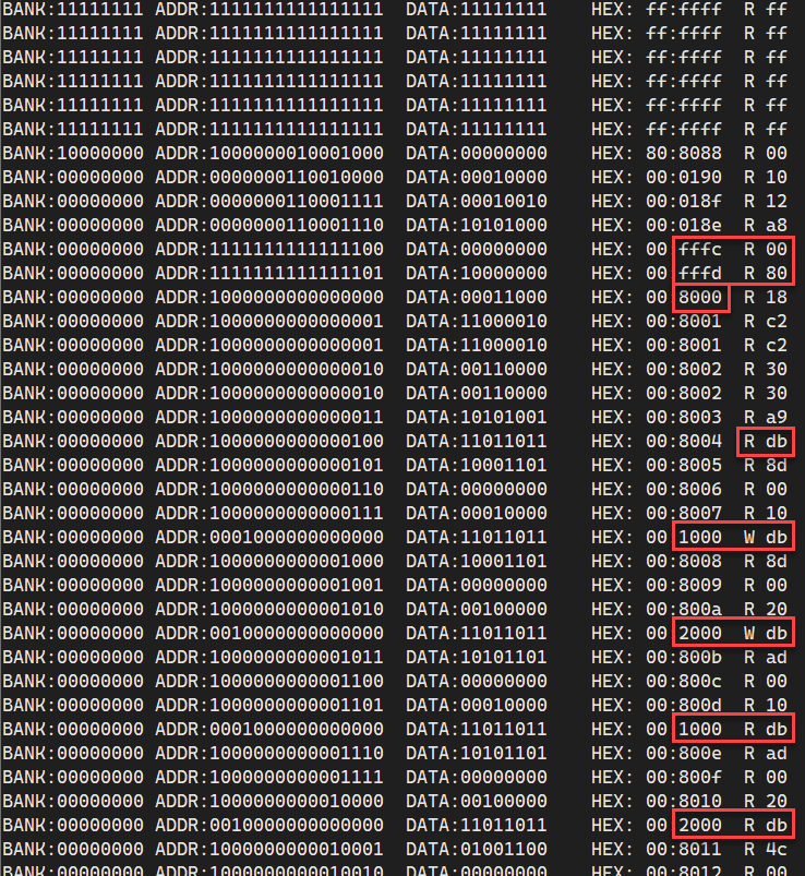 This is an unrelated issue, but your reset vector is not set up properly. Here, the CPU reads from 0xFFFC and 0xFFFD, which both return 0xFF. Then it jumps to 0xFFFF, where it against reads 0xFF. That's a SUB long,X instruction, so it reads the next 3 bytes as data (0x0000, 0x0001, 0x0002 which all return various values). Then it reads 0x30C29C (so at least this means your bank address latching is working, since this is outside of bank 0