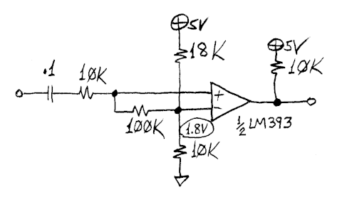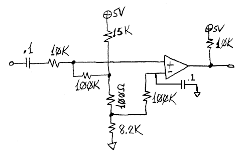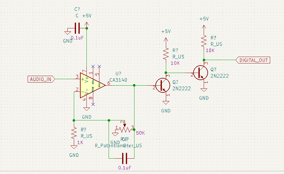 Anyways, the two 2N2222 transistors step-up the signal coming out of the OpAmp from around 3V or so to 5V. I'm getting a nice clean signal on a plain ol' 74HC00 with this! Does this look right to you guys? I am extremely new to analog stuff. Looking stuff up online has helped a bit of course.