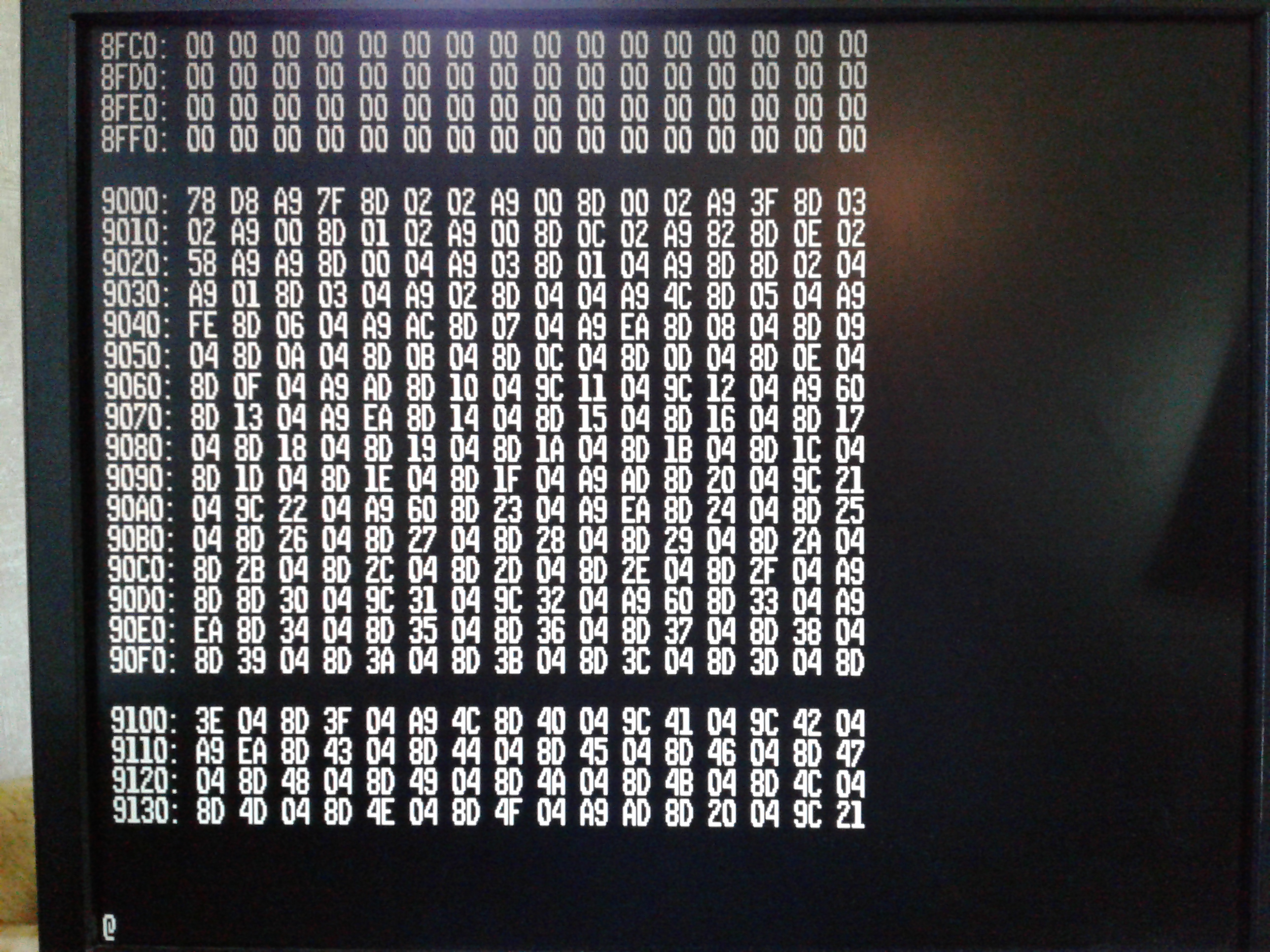 Ah, yes. Much more readable. For a little coding exercise, you could add to the memory dump to also display the bytes as ASCII characters, as well as hex. I've found that useful many times during debugging sessions. You can see that in the Supermon 816 memory dump.