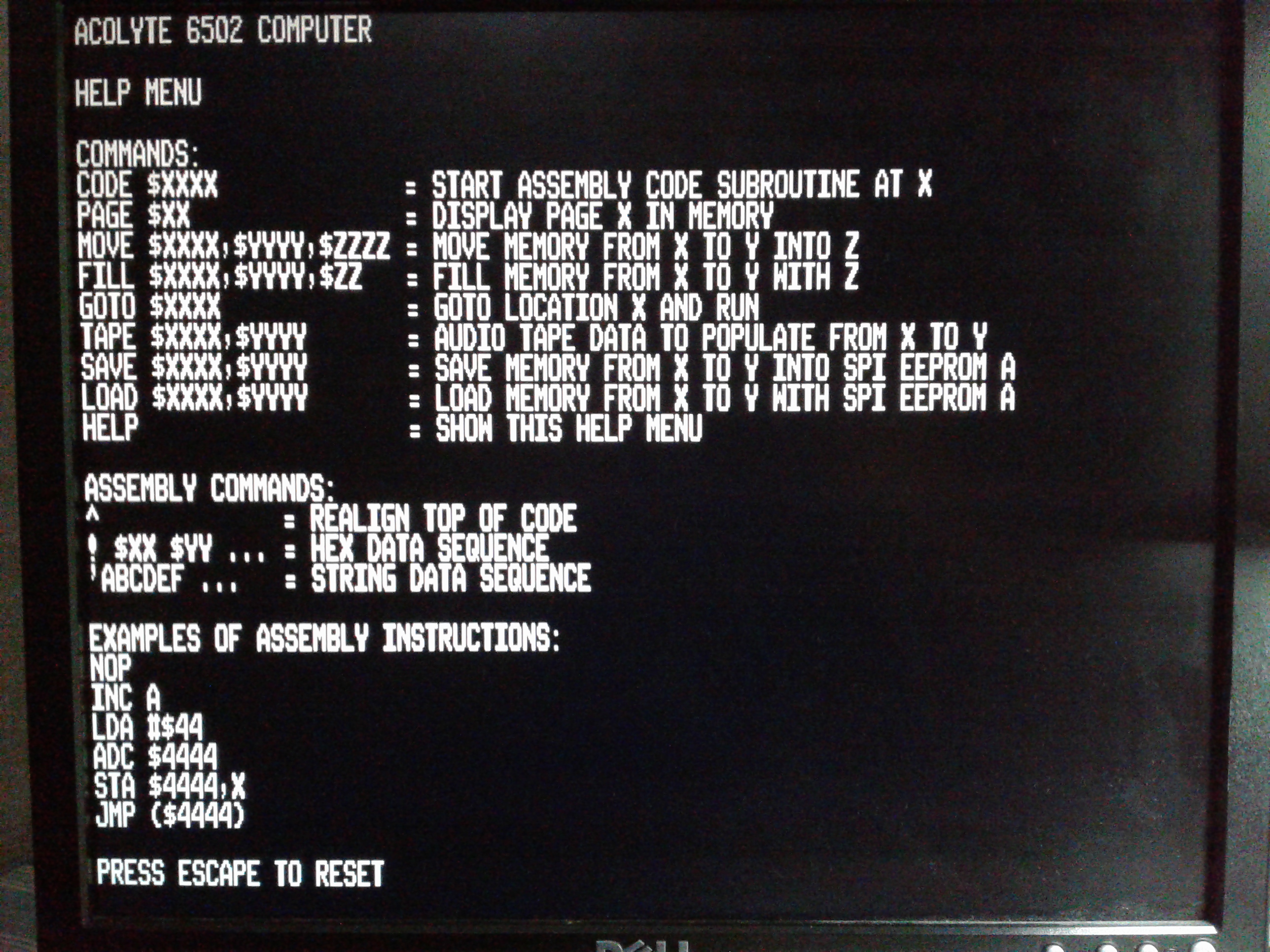 Also, the monitor commands you've listed in the help screen can all be single characters, such as A to assemble, M to dump memory, etc. When one is debugging, the less typing required to do something, the better.