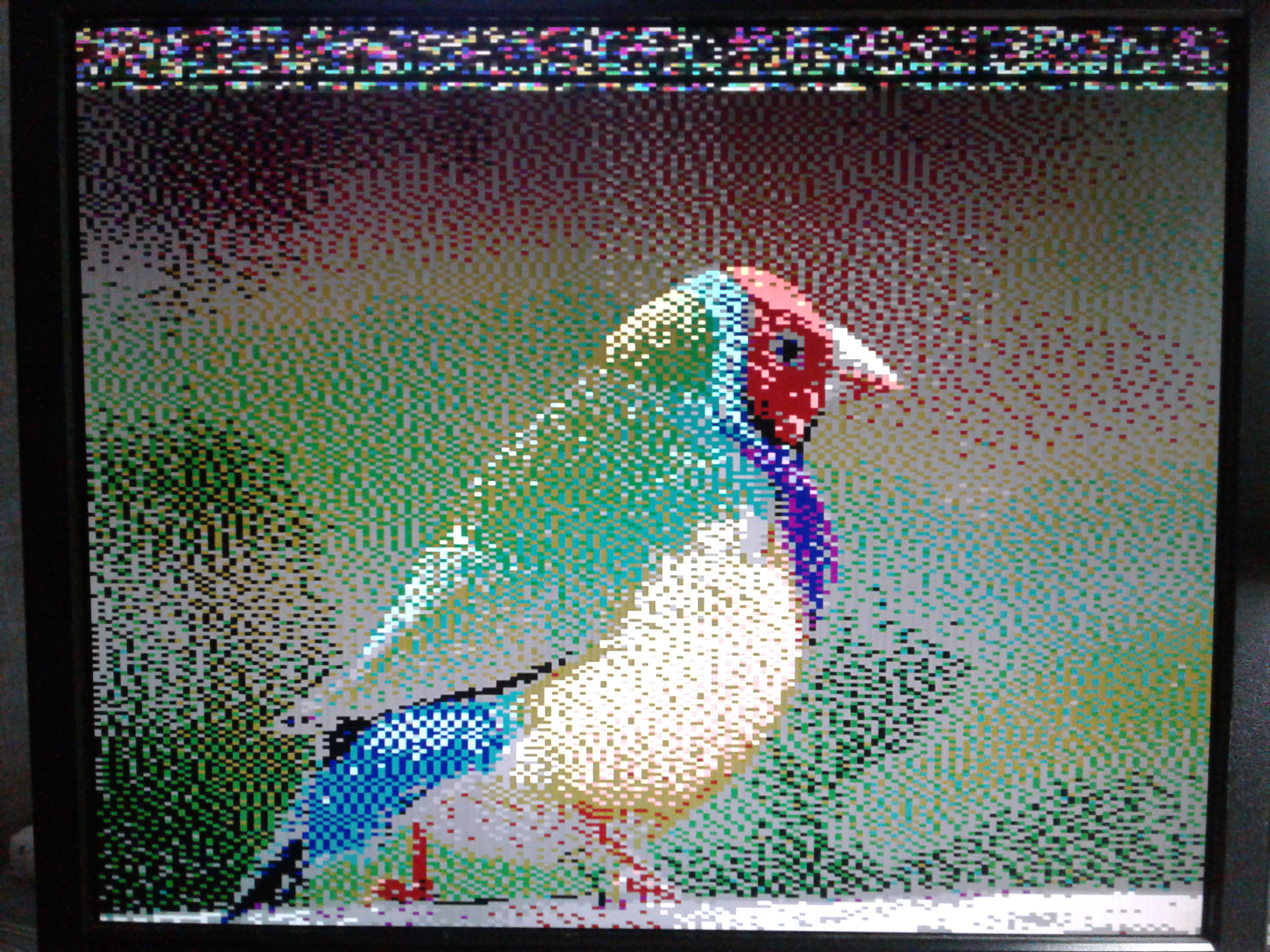 That put the bird data up top. Then I read the first 128 BLOCKS of data (that is 32K in bytes) from the SD card and put it into RAM. Then just pushed the RAM into video RAM and there you see the bird! The very top weirdness is just zero page, stack, I/O, expansion, and RAM variables.