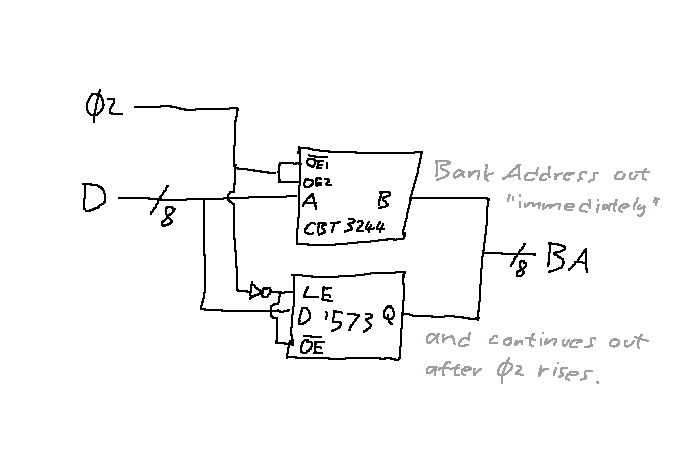 On the '816, there's the matter of data-bus contention. A '245 on the data bus will prevent this, although it, too, needs to enable its outputs only when Φ2 is high. It takes care of the possibility that something else on the bus whose OE\'s are gated by Φ2 don't turn off soon enough when the '816 tries to put the bank address out on the bus, or the possibility of something out there responding with data before the '816 quits asserting the bank address. Jeff's excellent topic is at viewtopic.php?f=4&t=2438 .