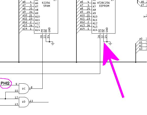 ... I'd suggest that you not ground the /OE on the EEPROM. Instead, I'd drive /OE with an inverted version of PHI2 (which you could obtain by using an additional inverter section, or -- less preferably -- simply getting it directly from the oscillator).