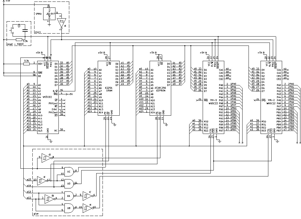 Thank you for keeping to chime in! I had one more inverter gate available in my glue setup, so that was an easy change. I have updated the breadboard and the schematic. On my board, the clock, reset setup (still to update) and glue are fairly self-contained, so I can easily change these out for a different setup. At some point, I want to add a PIC, a CPLD and/or an ATmega to poke around with (mostly to see what they can do), maybe have one of these handle the glue glue tasks to "clean up" the hardware (or completely mess it up, but it will be easy to revert to this working setup).