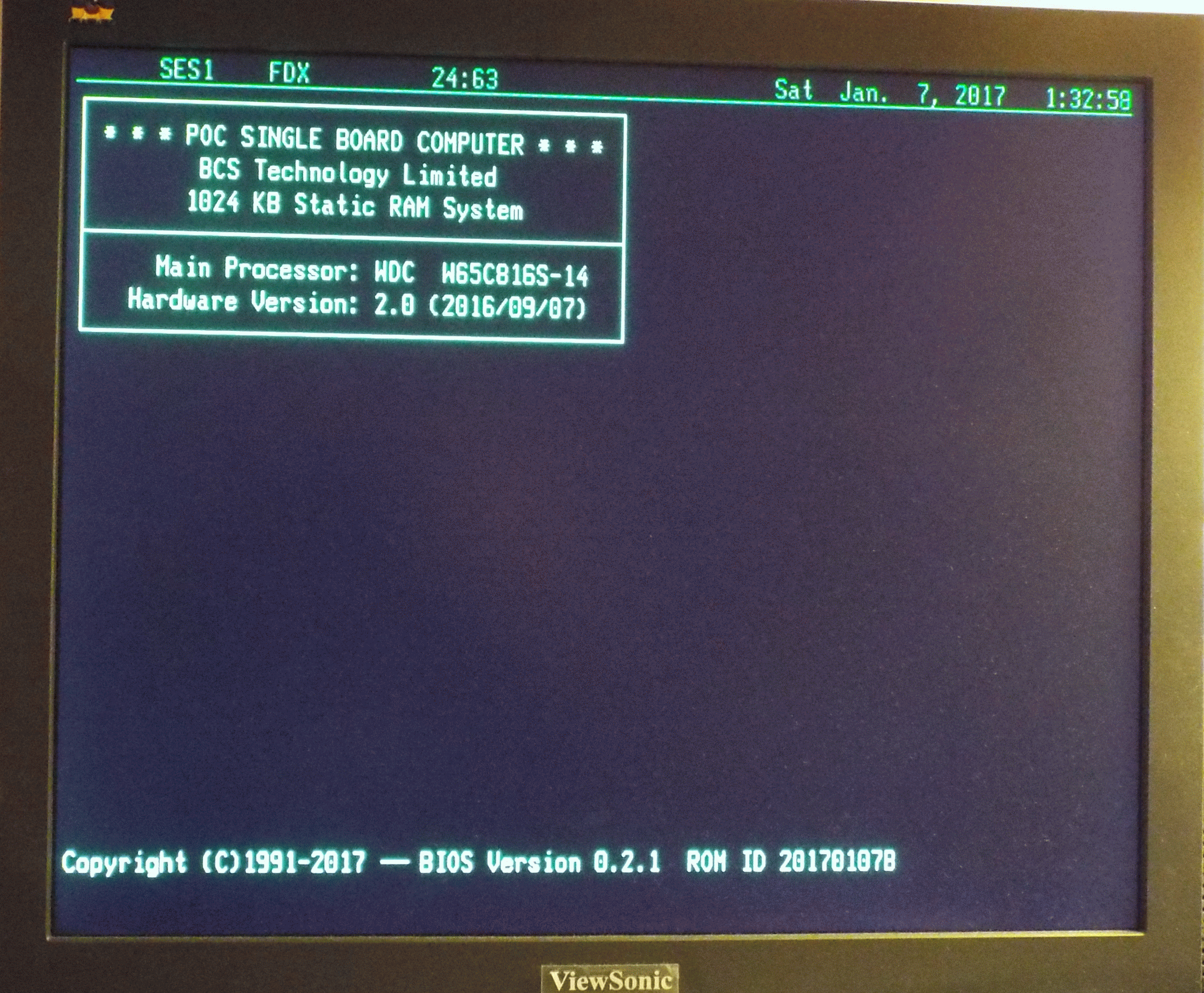 The key difference between the two machines is the use of a CPLD as glue logic in V2. Other than doing detailed timing analysis, I've verified that the logic works in-circuit exactly as designed and as simulated. I definitely have full RAM access, and the QUART gets a chip select when it should, responds to read and write operations, etc. I can drive the console display via polled I/O (pic attached) and, in fact, verified that I can also drive TIA-232 ports C and D (port B is wired for data transfers from on of my Linux boxes, so I can't yet test it). So I'm confident that there are no hardware anomalies, or at least no show-stoppers.