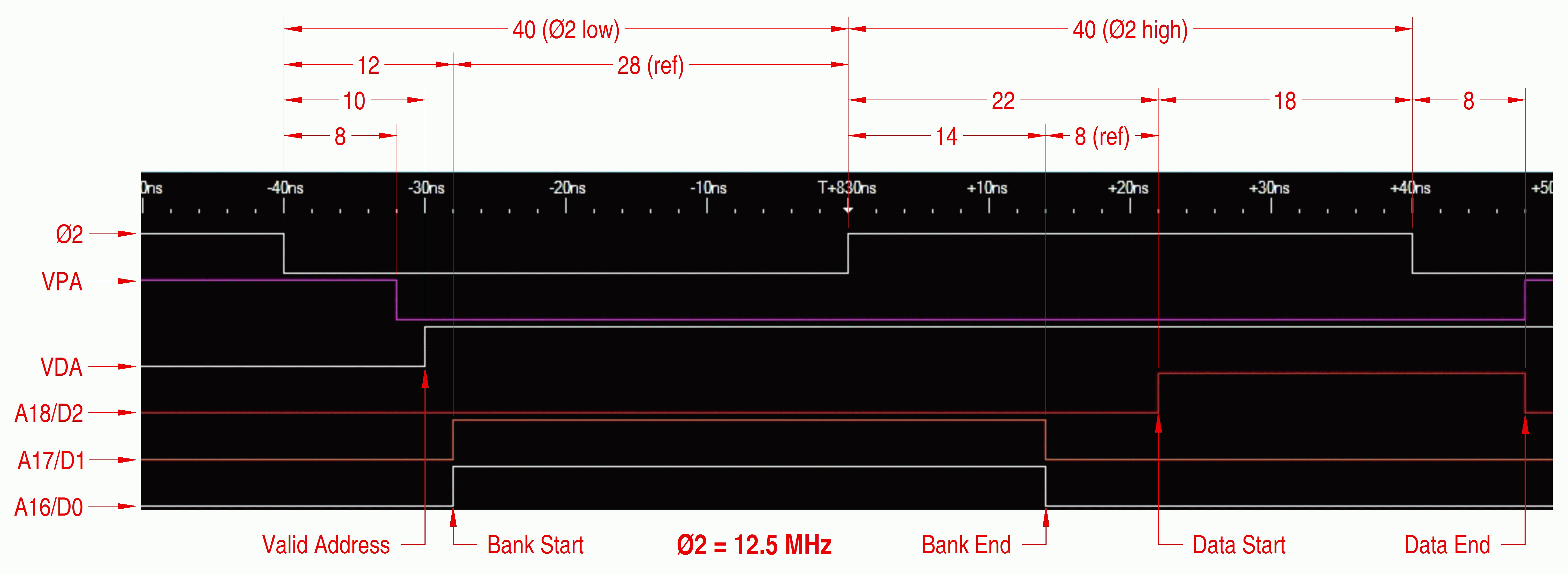Also, note the 8ns period between when the '816 stops emitting the bank and the addressed device (RAM, in this case) puts data on the bus. In my POC designs, the Ø2-qualified read/write circuit drives /RD low one gate delay after the rise of Ø2, which ranges from 1.9ns to 6.6ns, according to the data sheet. Assuming the gate's performance falls near the middle of the spec, it would mean the RAM is responding with considerable alacrity to /RD.