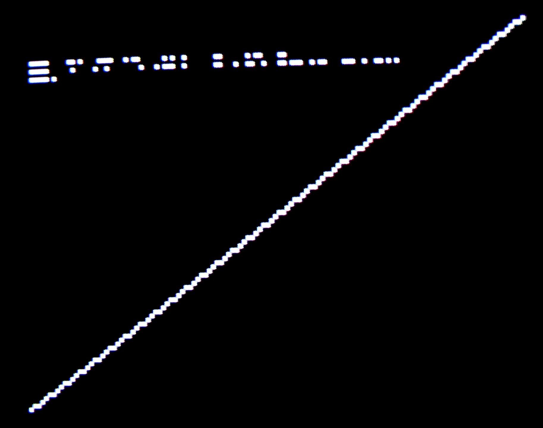 And another test with the semi graphics mode. This is a mode from the 6847 which supports mixed text and low resolution graphics by dividing each character cell in 2x3 pixels and using a 64-character range to represent all combinations. The Atom ROM has support to draw lines in this mode. Resolution is quite limited at 64x48
