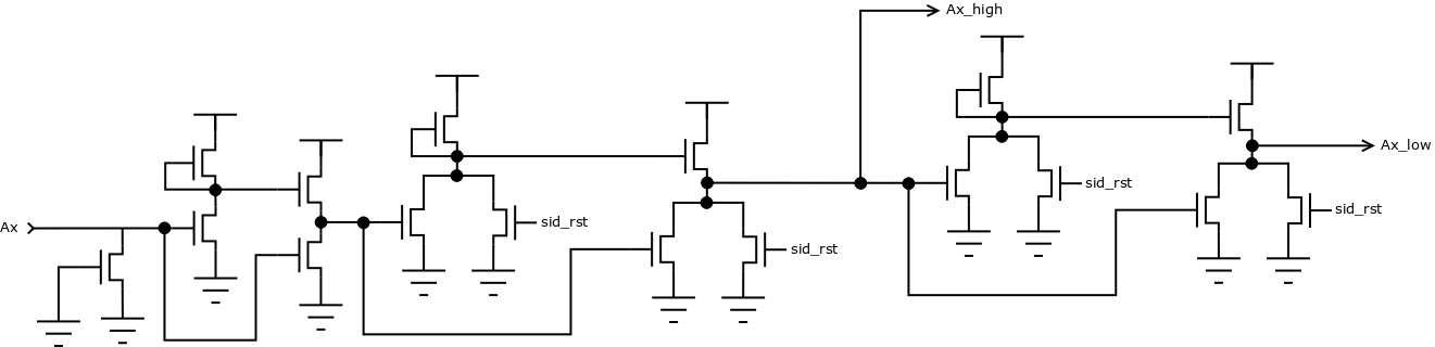 Again some big transistors to control timings, but basically this produces two signals, one of which is high when the line is high and the other when it's low. During reset both signals are held at zero.
