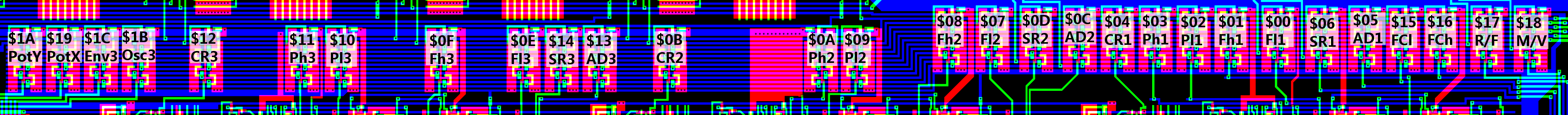 An interesting thing to note is that in the 8580 the upper eight triangle selector transistors are narrower than the others while the lower four and the sawtooth ones are slightly wider. In the 6581 all selector transistors are the same size.