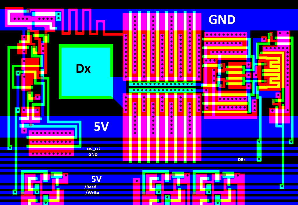 When the /write line is high the input is disconnected from the data bus, otherwise the data from the pins is written to it, unless the sid_rst signal is high in which case a zero is forced unto the data bus.