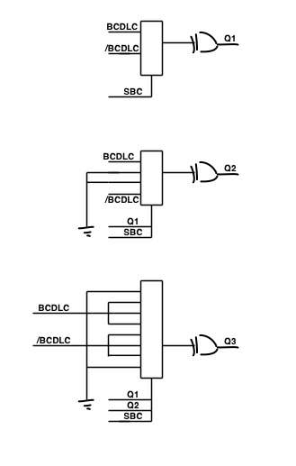 In this diagram, BCDLC and /BCDLC are the positive and negative outputs of the [$A..$F] Detect ‘151. They are connected to the Data Inputs of the subsequent FET Muxes. The Select Inputs take much longer to resolve, and use only signals which are available already by the time BCDLC arrives. The switching time of the MUXes is therefore taken out of the critical path. :D