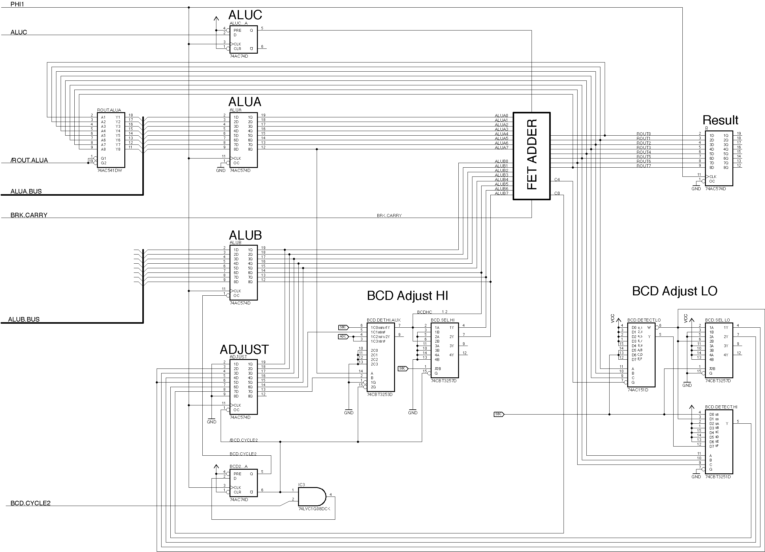 Thanks to Dr Jefyll and ttlworks, the BCD adjust circuit in the C74-6502 is very fast already, and we can adapt it for our purposes here. This circuit produces results that are compatible with the NMOS 6502 for both decimal and non-decimal inputs. It uses FET Switches for time critical logic. With a little rejigging, we can adapt it to work in this new design, as is shown in this rough schematic: The high-nibble Adjust Value is generated by four FET Muxes in series (BCD.DETECT.HI, BCD.DETHI.AUX, BCD.SEL.HI and ALUB.SEL). This value is then fed into the high-nibble of the FET Adder. Earlier tests showed that CBTLV switches took about 1ns longer than AUC parts in the carry chain. The Adjust Value path is therefore likely to delay the adder result by that margin as well. Thankfully, because the results of Decimal Mode operations are never used as addresses, the Adjust Value path does not have to meet the 1.5ns setup time of the synch RAM. We therefore should have just enough extra time for this path to work.