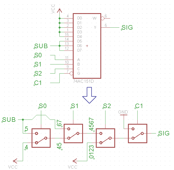 This not-so-good replacement might require additional ICs, but can be functionally equivalent. For example, the inverted output of the ‘151 might have to be implemented with a 74AUC1G04. Or (if the additional delay associated with the inverter is unacceptable) we might go with two 74CBTLV3251s, and have one with the data inputs inverted. You are also right to point out that the enable input (/G) works differently on a 74AC151 than it does on a 74CBTLV3251. They are equivalent when the /G input is driven low, but when driven high, the CBTLV tristates its outputs, whereas a 74AC151 takes its inverted output high and its non-inverted output low. This behaviour can be emulated with a pair of 74AUC126s and in inverter.
