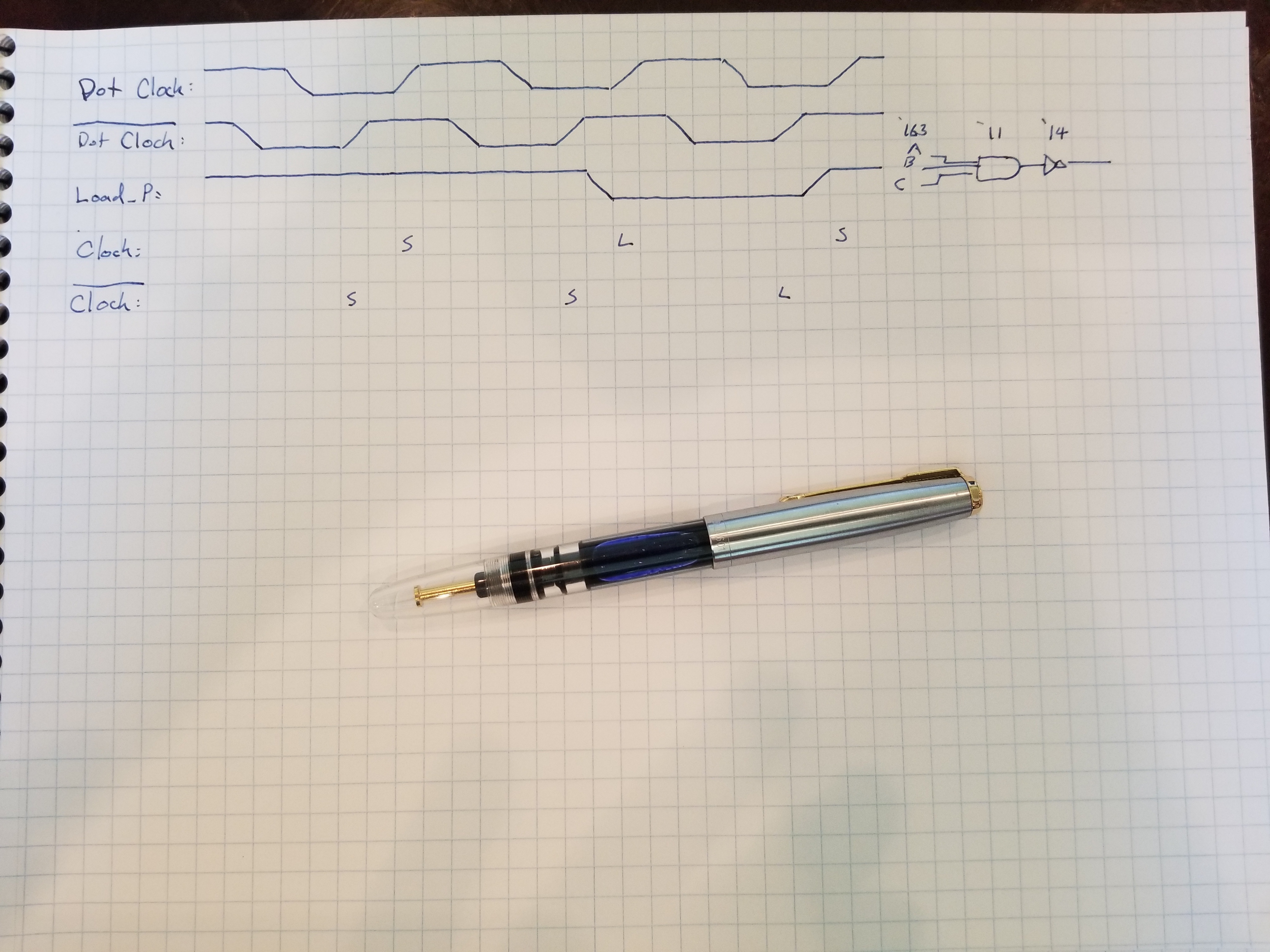 But in reality, the inverted clock is no where near that out of phase with the pure clock, and the load pulse seems to lag by substantially less. This is a bit of a head-scratcher for me: when I start moving the design to perfboard how much change to expect? Maybe the "by the sheet" version will work, and the "inverted clock" version only works because of some contingent breadboard thing, like some particular long wire, or excessive inductance. (What I mean is, they appear to be almost not out of sync at all. But maybe they're so out of sync that the inverted signal is a bit more than a whole cycle late.)