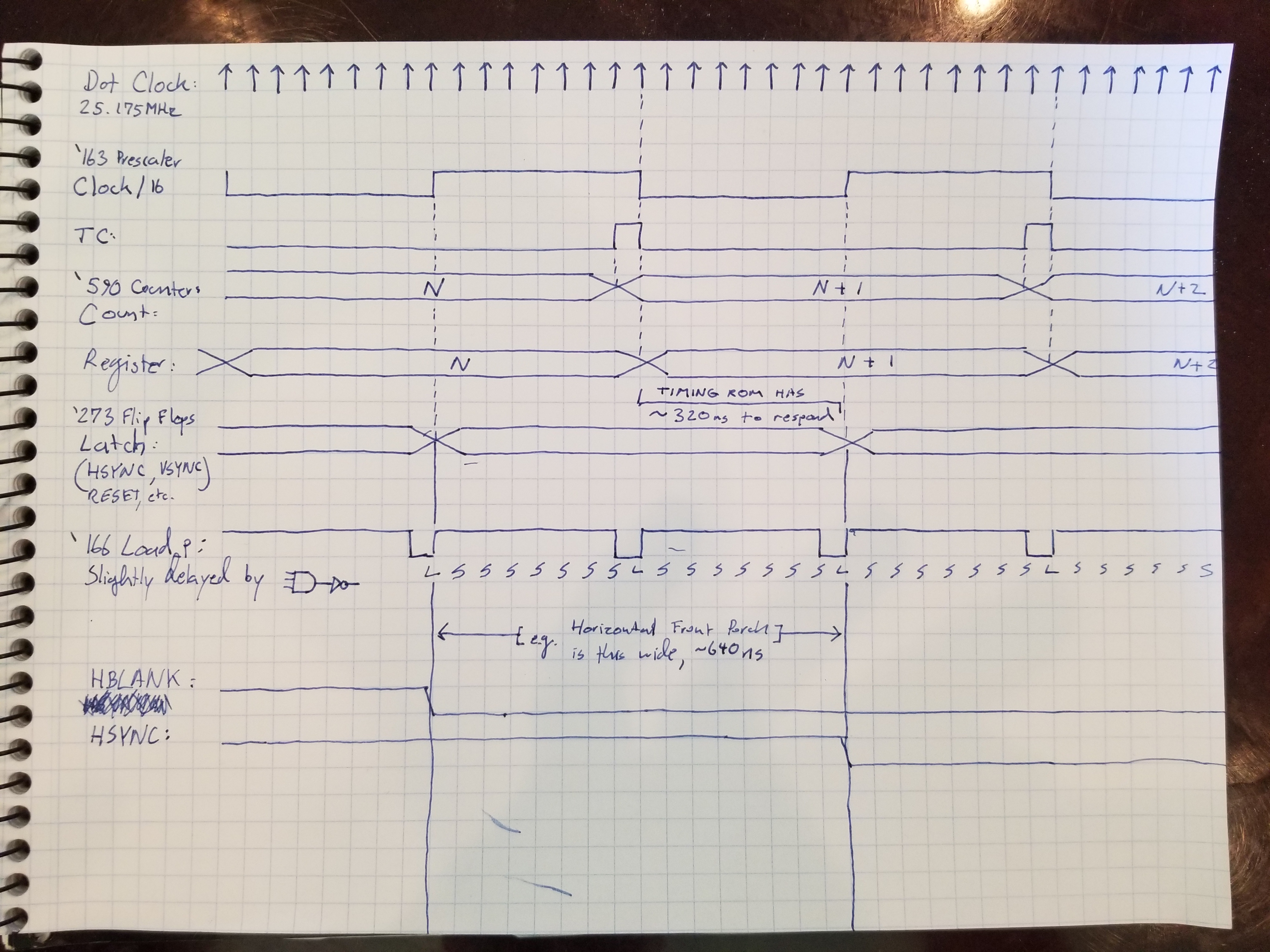 Of course, I did plan it. ;) In the original version, with a separate `163 to generate the load pulse, I figured since the `163 and the `166 were both driven by the dot clock, the load pulse would lag the clock by about 20ns, giving roughly 20ns before the next rising edge of the pixel clock. This should meet the `166's setup time requirement (it has no hold time requirement). I guess this is an "expectation vs. reality" discussion. This version never did work well; in addition to the missing character, it rarely produced artifact free video. That it could SOMETIMES produce artifact free video seemed to suggest to me that the issue was with the relationship of the load pulse to the HSYNC/VSYNC signals, since the `163 generating the load pulse was the only thing not clock-locked. Also, on the scope, the load pulse seemed to lag much less than the typical propagation delays listed in the data sheets suggested it should.