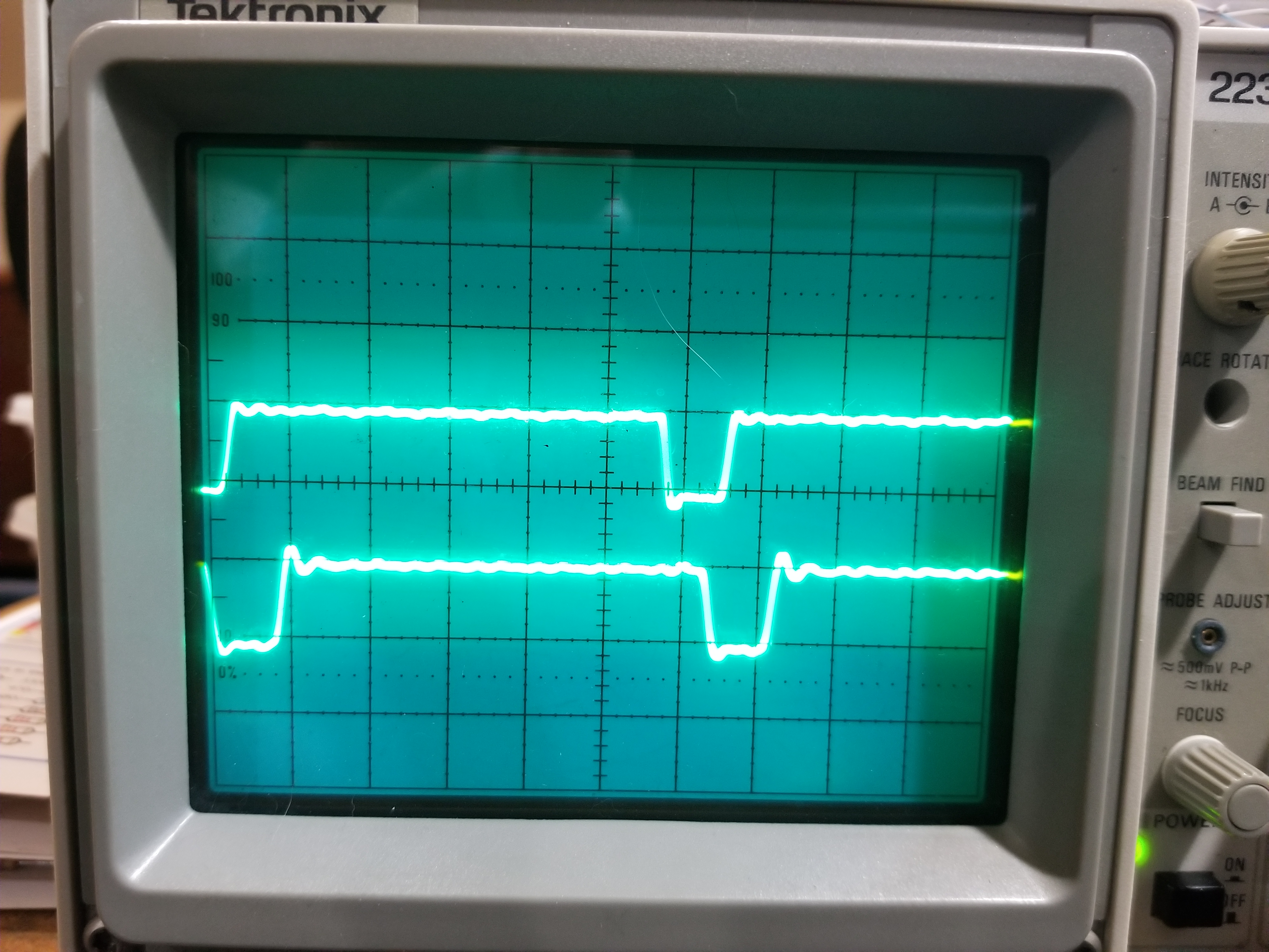 I have an old 200^H^H^H100Mhz 2-channel Tektronix analog scope. (I could have sworn it was a 200MHz one, but the evidence to the contrary is right there in the photos... :lol: )