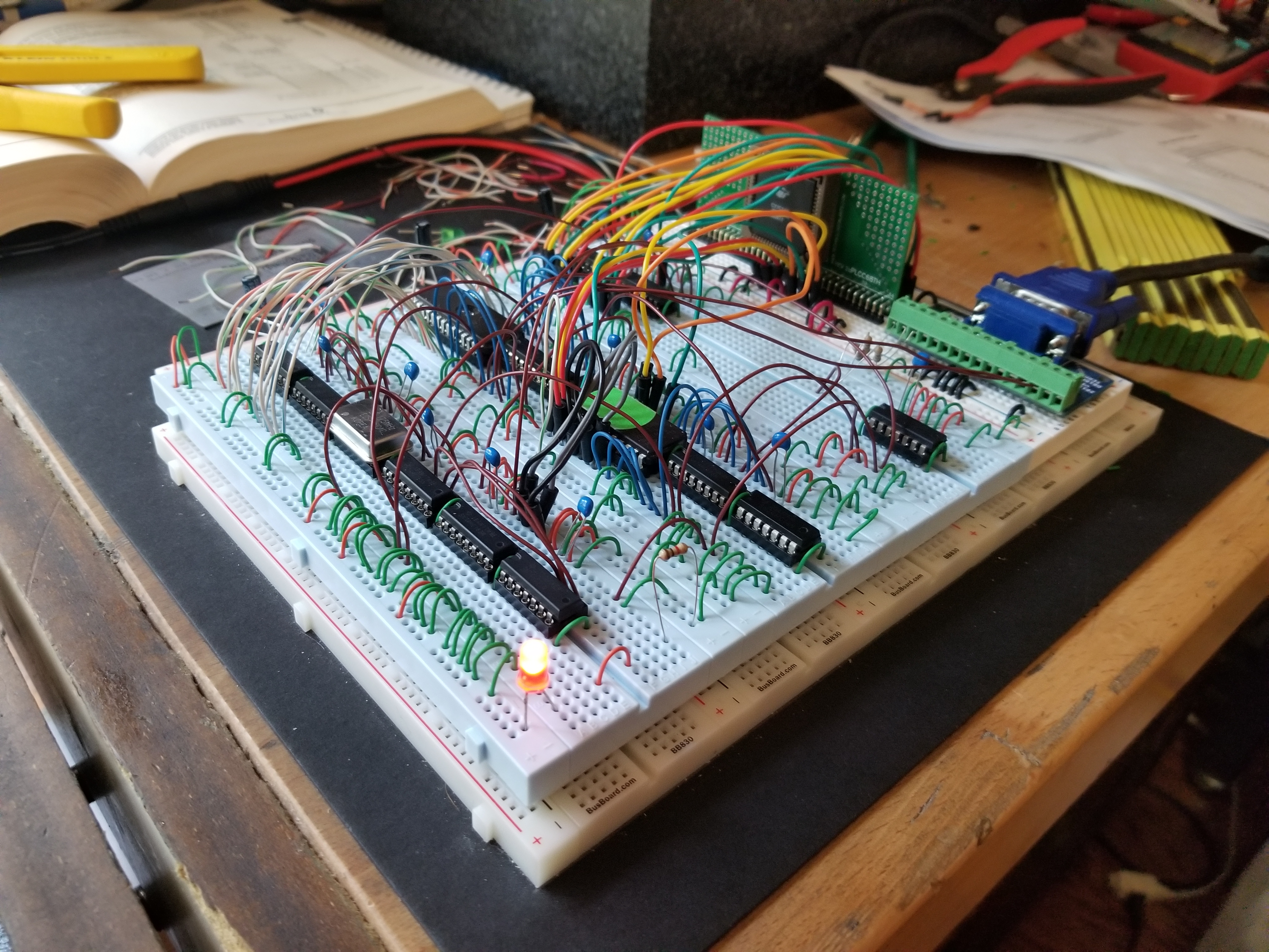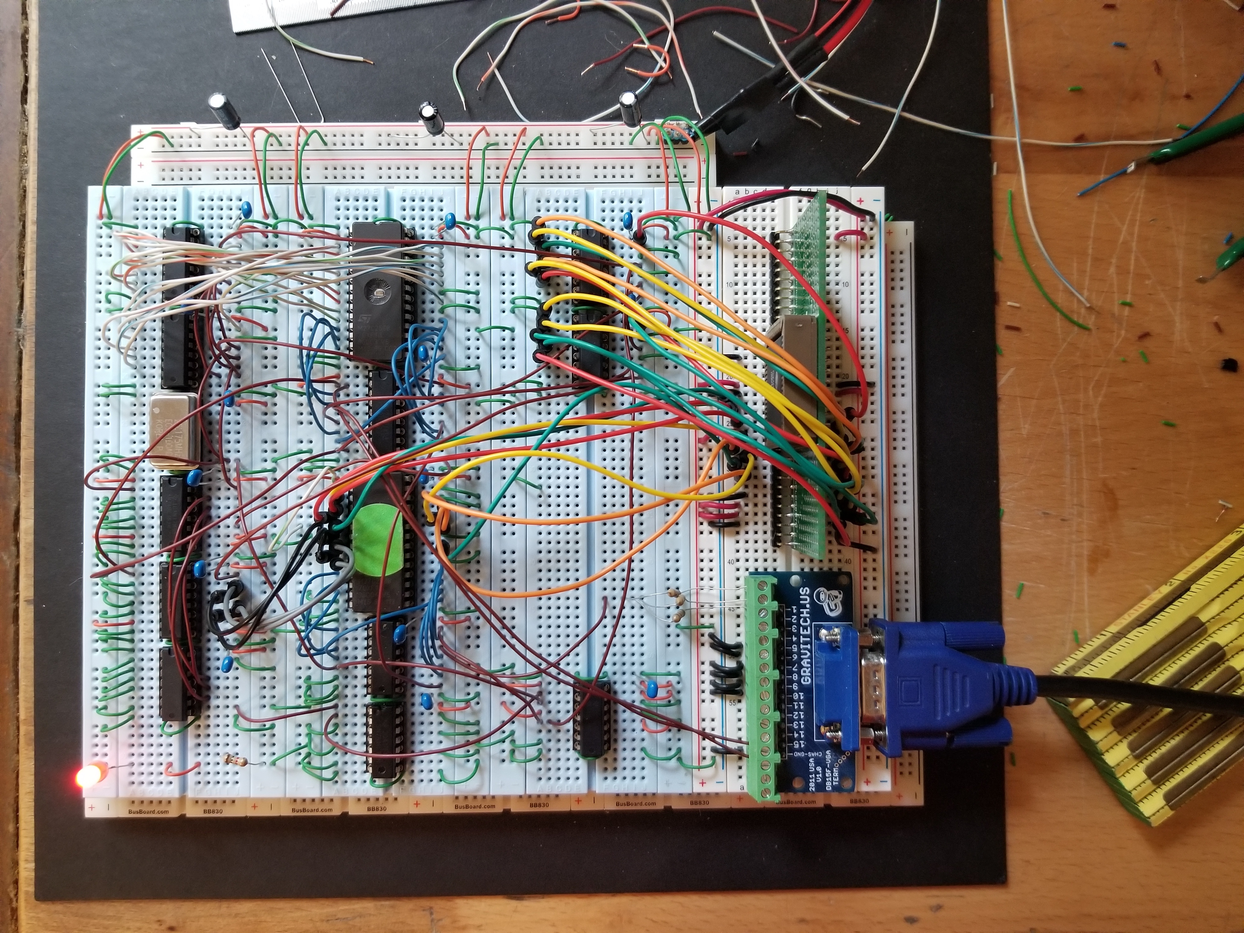 - Fourth breadboard, the dual-port RAM and VGA adapters. These breakout boards were kind of expensive compared to everything else, but they really made things a lot cleaner / easier, so I'm glad I went ahead and bought them.
