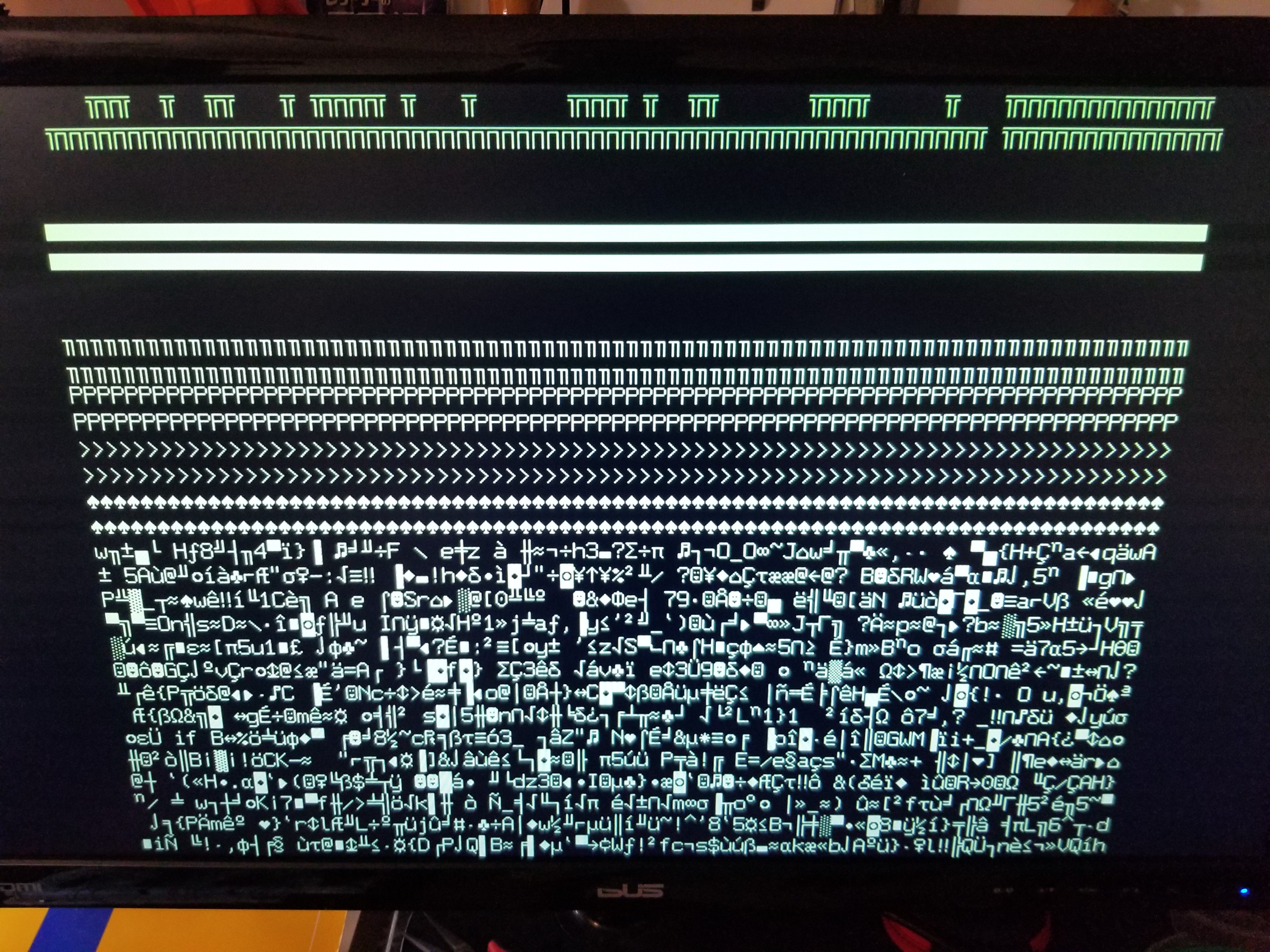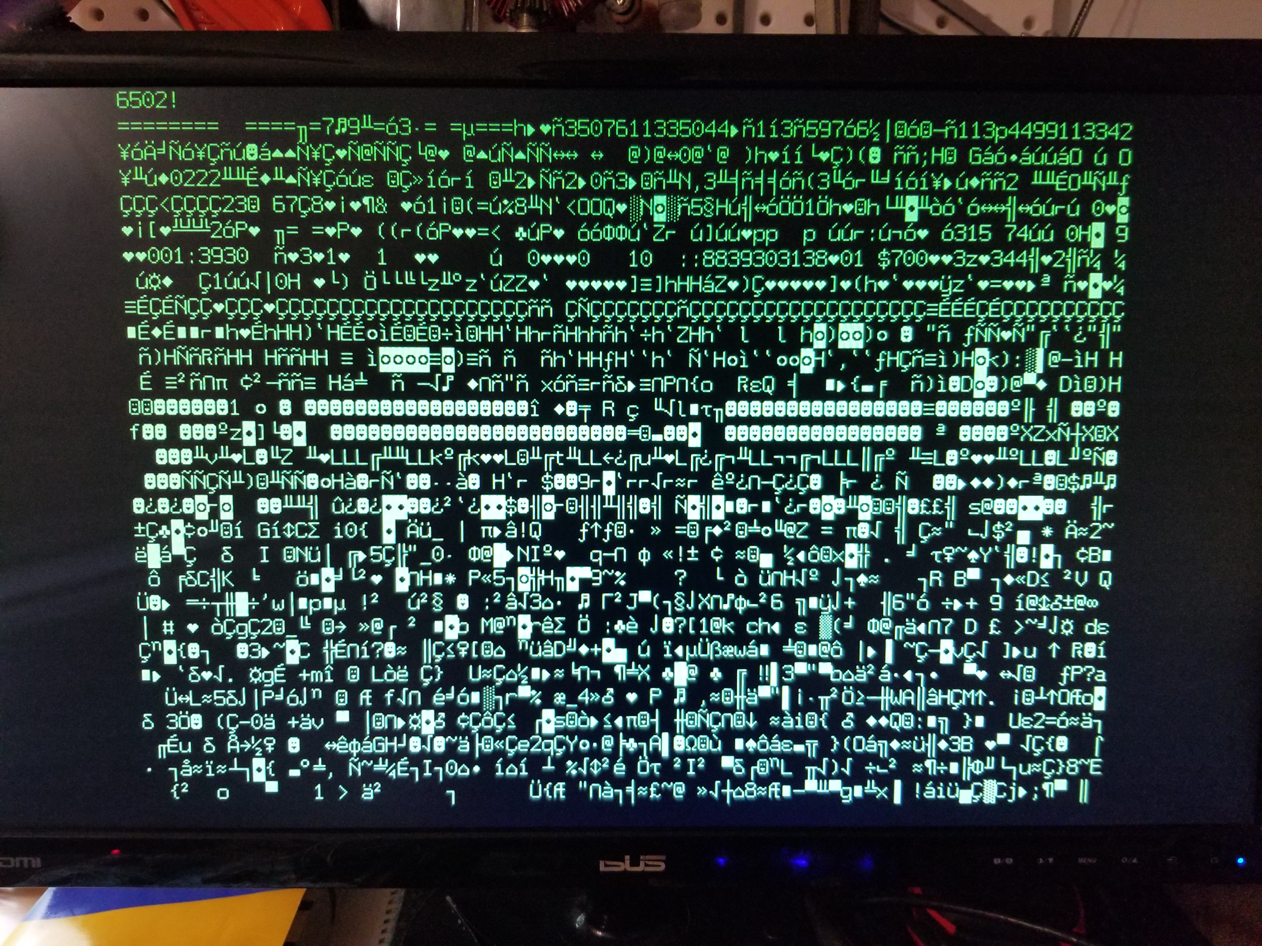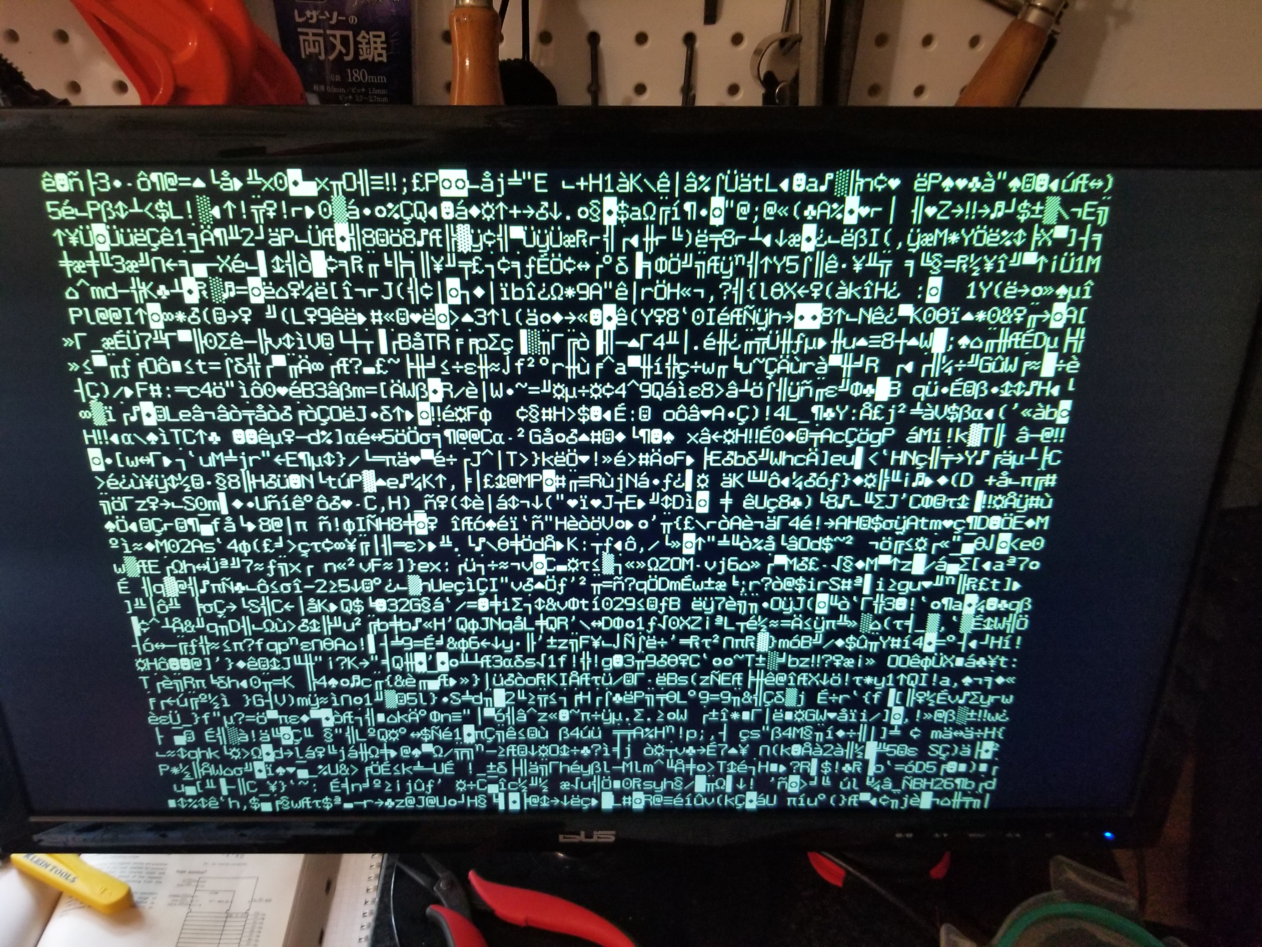 This "video card" isn't "installed" in anything yet, so there's nothing writing to the other side of the dual-port RAM; right now it's just dumping whatever is randomly in there as character data. Still, it shows that at least for some area of the RAM, my timers are working. Once I rejigger Peanutbutter-1 a little (I'll have to mess with the decode logic to free up a block of address space) I'll be able to check and see if the corners / center are in the right place.