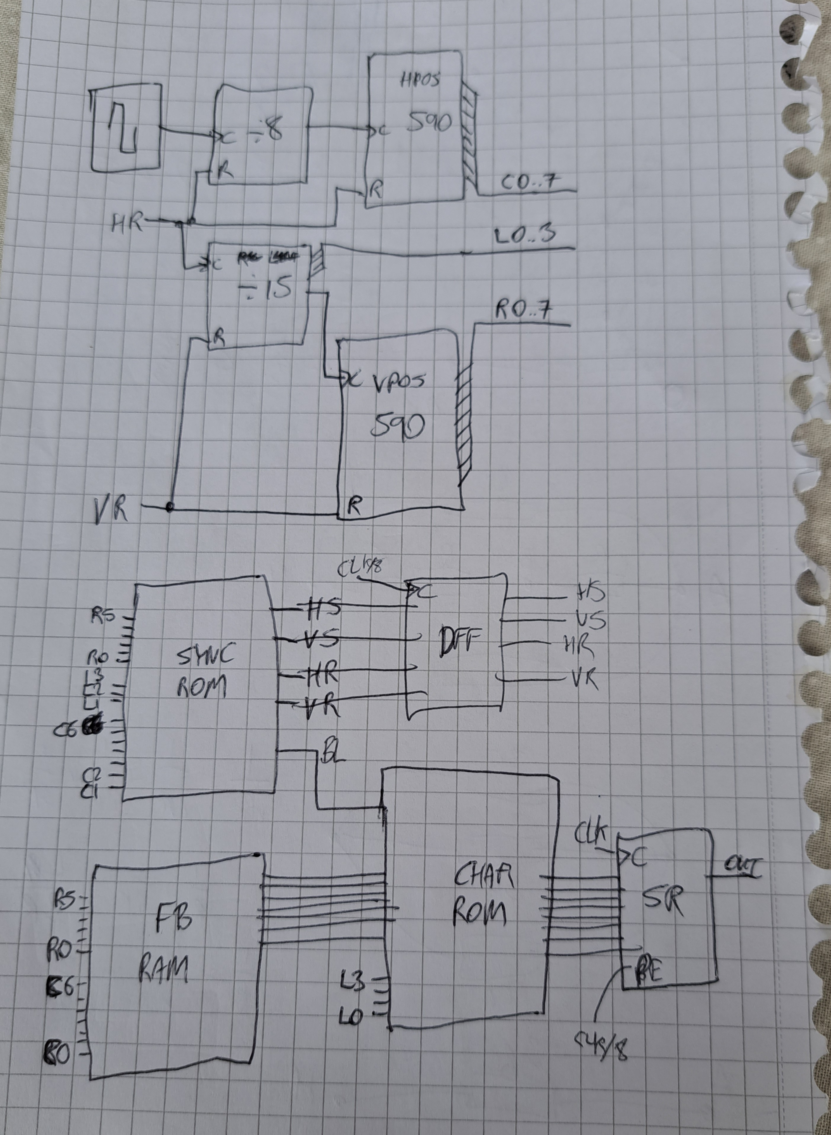 Great to see. Where do VSYNC, VBLANK, and BLANK come from? More counters based on the shift register load signal, maybe going through logic gates to compare against key values? Is BLANK just for horizontal blanking or combined blanking?
