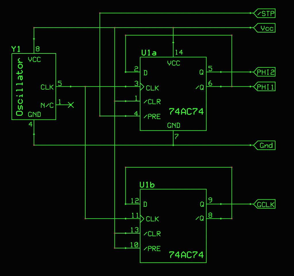 Naturally, solutions may give rise to new problems. Since it would be the CPLD that would make the determination when a wait-state is needed and how long it should be, it must have a continuously running clock input and most importantly, that clock must stay in sync and phase with the Ø2 clock when the latter is not halted. The unused second section of the flop can be used to produce the CPLD's clock, which is referred to as the GCLK.