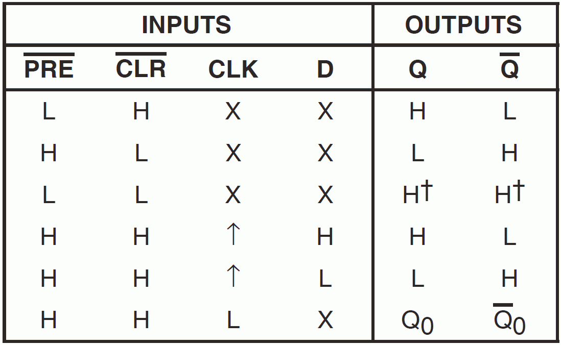 In particular, note the first row in the table, in which /PRE is low. In this case, Q will stay high and /Q will stay low, without regard to what is going on at the CLK and D inputs. Q high and /Q low is the Ø2 high state.