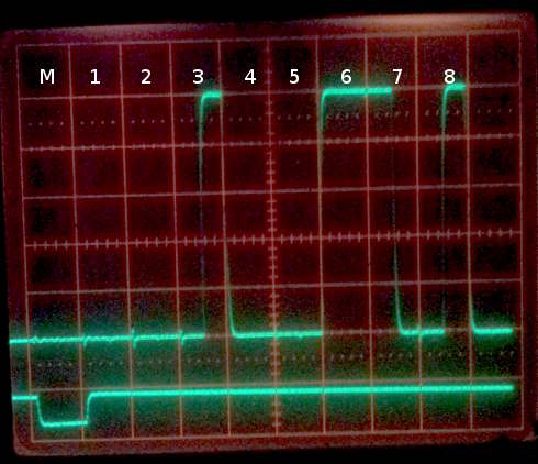 Here we go again, this time with new chinese scope probes and a marker on the other channel to incontrovertible identify the machine cycles. The marker is an unused output of the IO address decoder. The signal shown is bank/data 0.