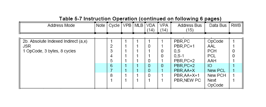 Getting back to JSR (<addr>,X), I haven't fully followed this topic but I assume you do know that the vector for JSR (<addr>,X) must be in the same bank as the instruction using it. That is, if your JSR (<addr>,X) instruction is in bank $04 then <addr> must also be in bank $04. Also, the program counter will wrap around if the expression <addr>+X would cross bank boundaries.