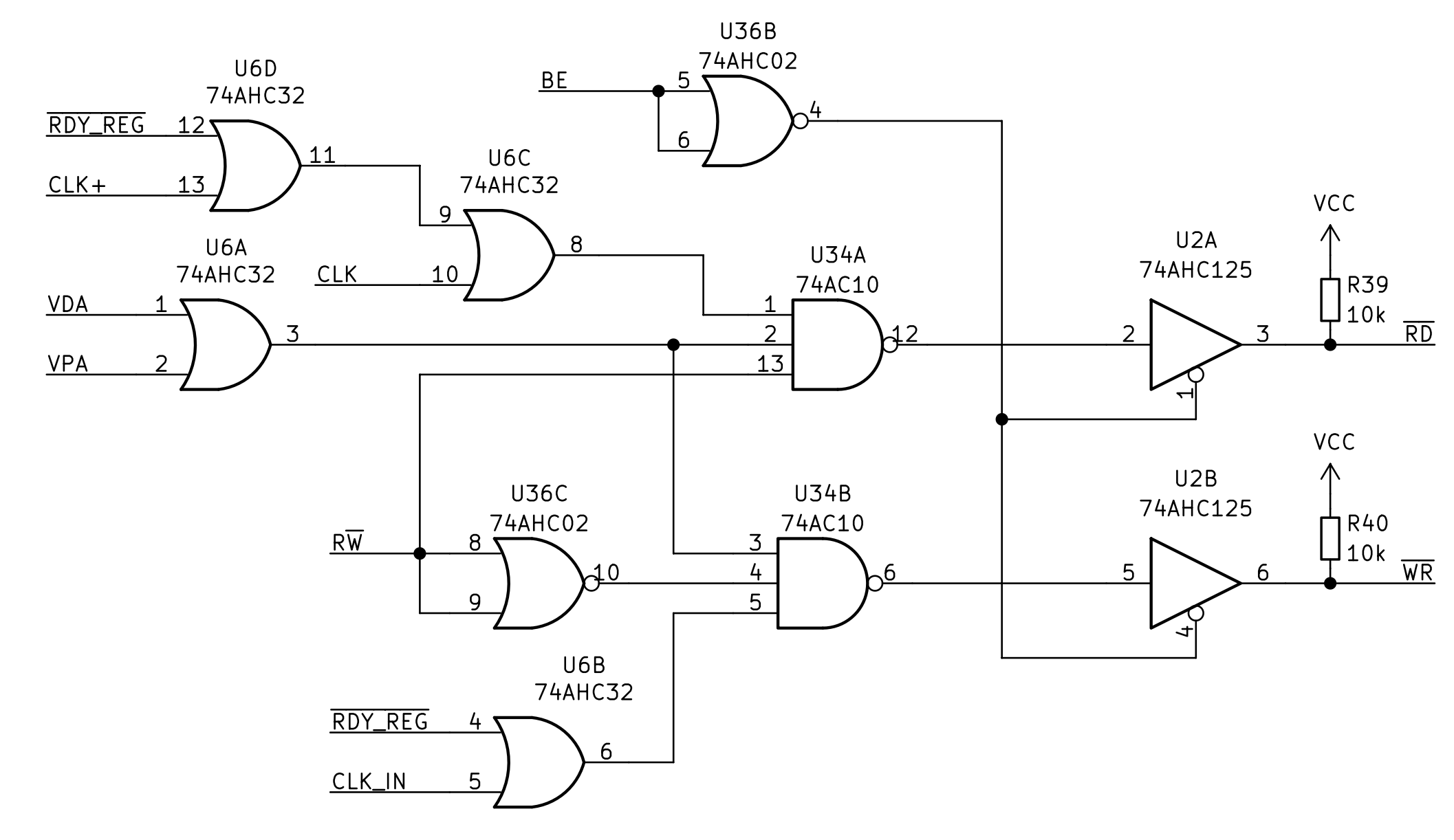 I'm pretty happy with the result of this episode. My read-write pulse generation is now working great and is also completely within spec on the timings. I did need to add the complexity of a third clock phase (this one shifted 20ns before the clock), but the circuit now takes into account all the control signals of the CPU (VDA, VPA, RDY, BE). I expect this clock phase to go away once I move to a fast SPLD but still, doing it in discrete logic was a fun challenge.