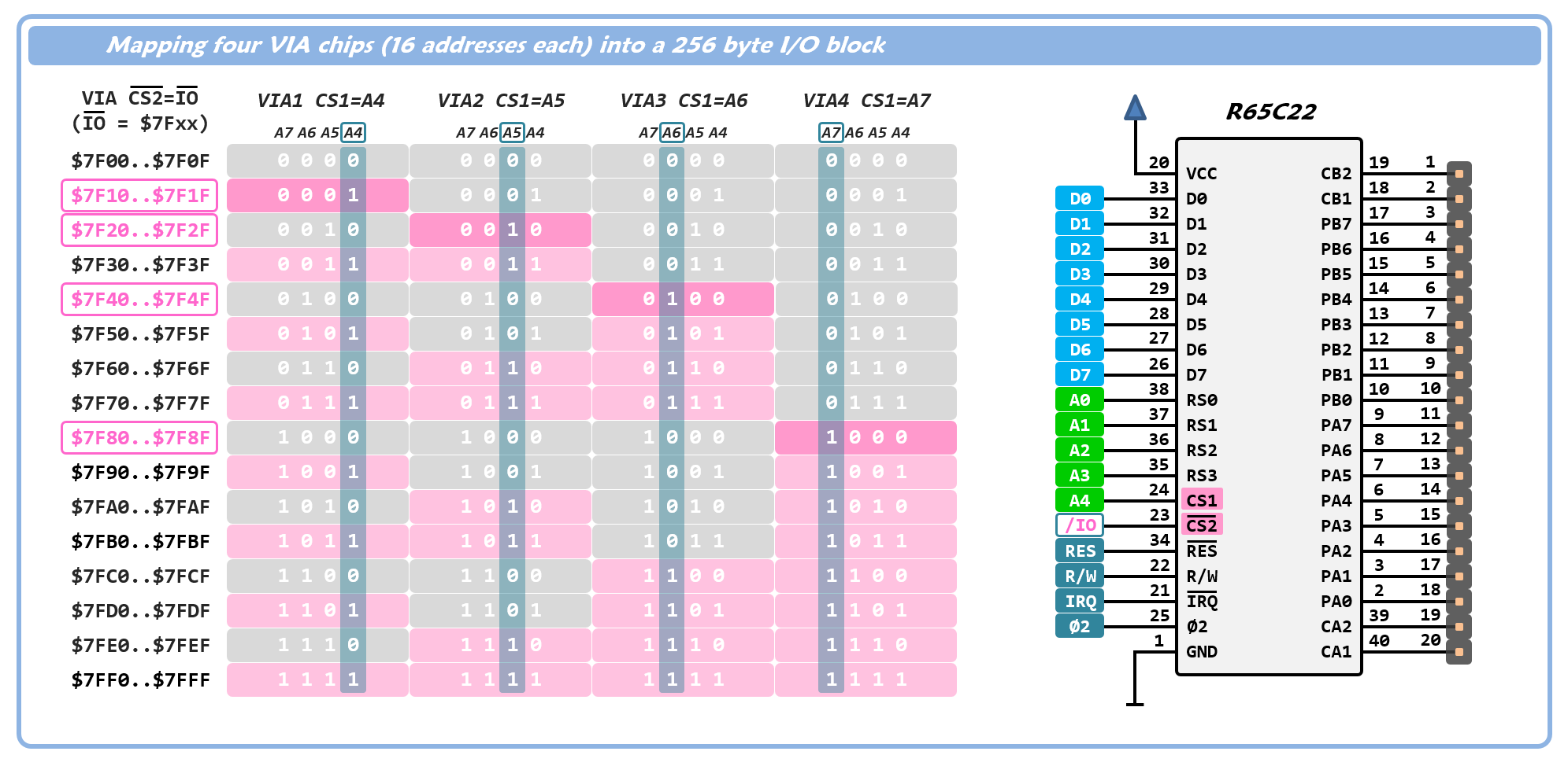 There's a lot to be said for a 74xxx138 (choose family to supply the delay your system can handle): two low and one high enable, and decoding of three address lines... so using A4-6 and an output - either polarity - for an iosel, and A7 and A8 if desired to add up to 32 VIAs!