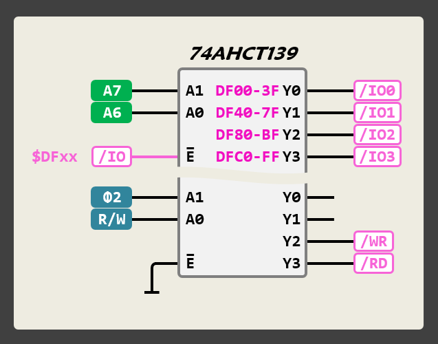 The above is a three-chip solution (not counting the decoder), including the qualified read/write. The memory map won’t be as granular as can be achieved with a GAL, but there would be chip selects for eight I/O devices.