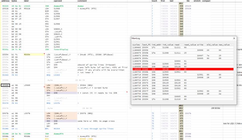 The workbench is reasonably fast enough to allow "slicing" the total dataset into smaller pictures = containing less cycles. I should thus be able to drill down to seeing a particular sprite drawn on the screen (write) and relate the bitmap to it's origin (read).