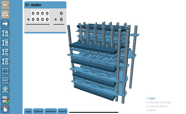 Found this link about Konrad Zuse’s Z1 Computer: Architecture and Simulation of the Z1 Computer. It includes an interactive 3D simulation of the adder (pic below), and a informative pdf about the Z1 computer.
