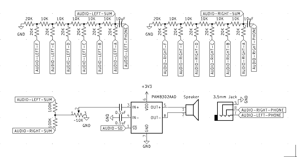 So, I think I'm going to assume what Jeff is talking about. The 100K ohm resistors can be reduced a lot, and a little bit of feedback on the other channels will just have to be as is. I'm not looking for absolute clarity, just some distinction between left and right, and I think I can still achieve that with some 10K ohms. I will test this theory out more fully later, but now I have to run to the college's graduation ceremony!