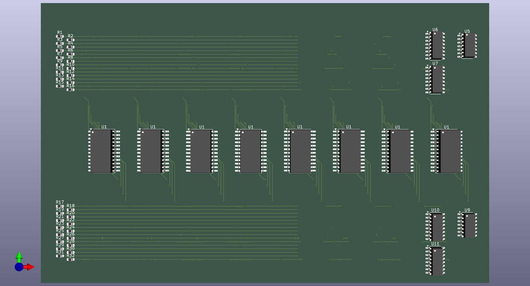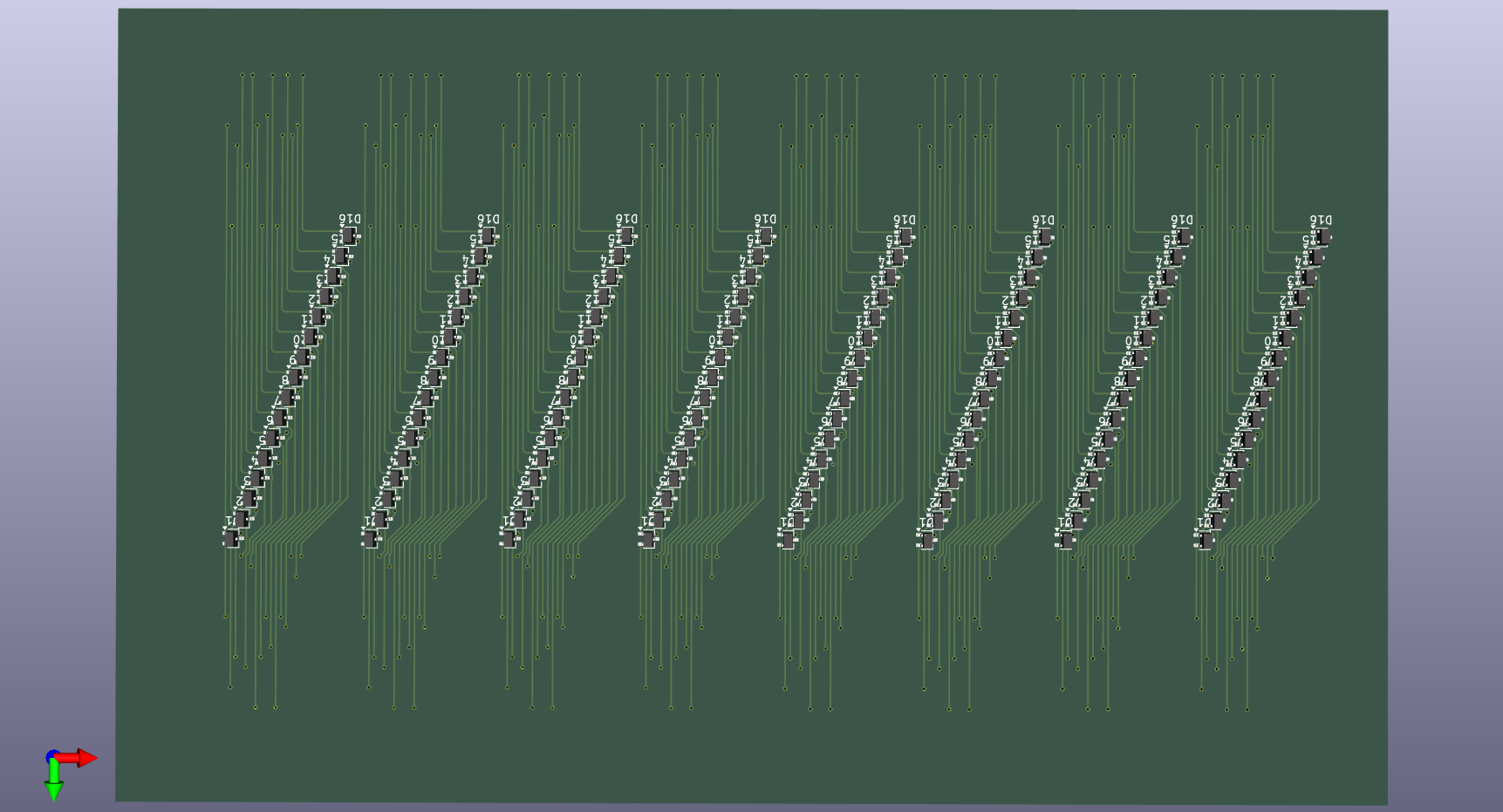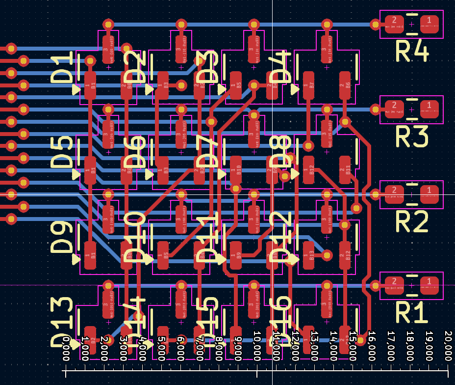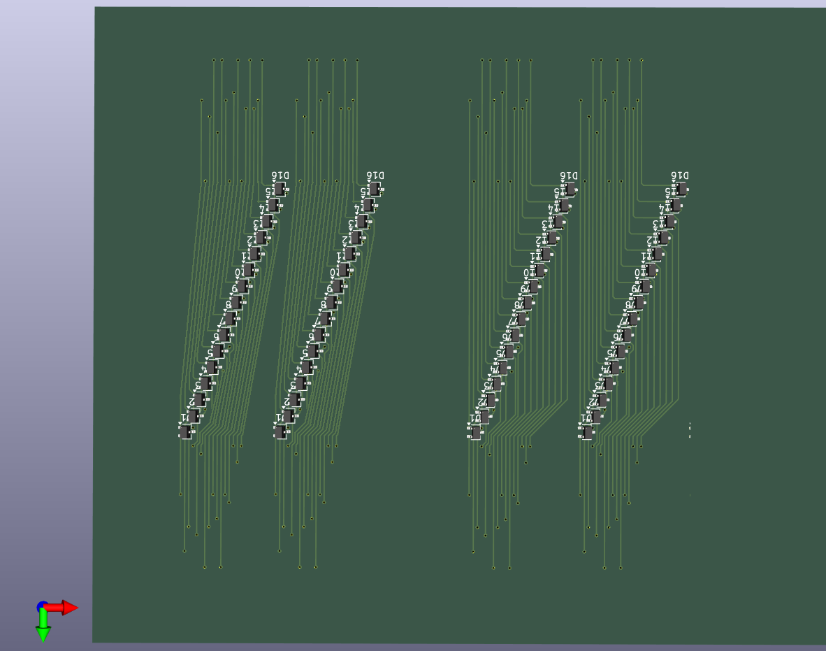 I'm not sure if something could be done with the diodes to split into two halves, as it were...Each of the 16 outputs of each decoder needs to route to a diode-array, which in turn feeds upward to one matrix and downward to the other. That's what the diagram is intended to convey, although I've put the diode in a really silly spot, and I'm sure you can do better. The final result might be fairly "busy," with traces running up and down from the diode arrays. But, as you say, space is available (and the board does have two sides