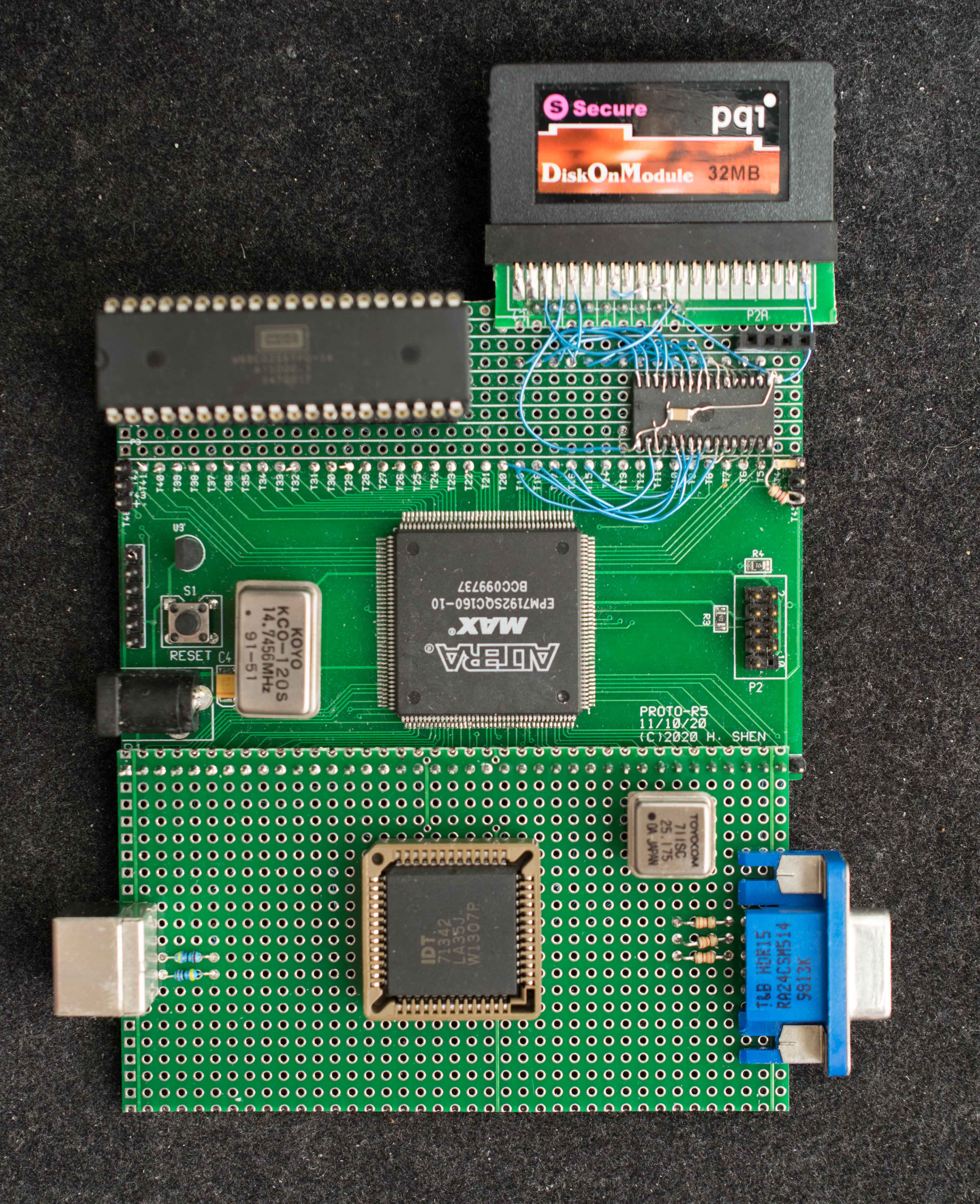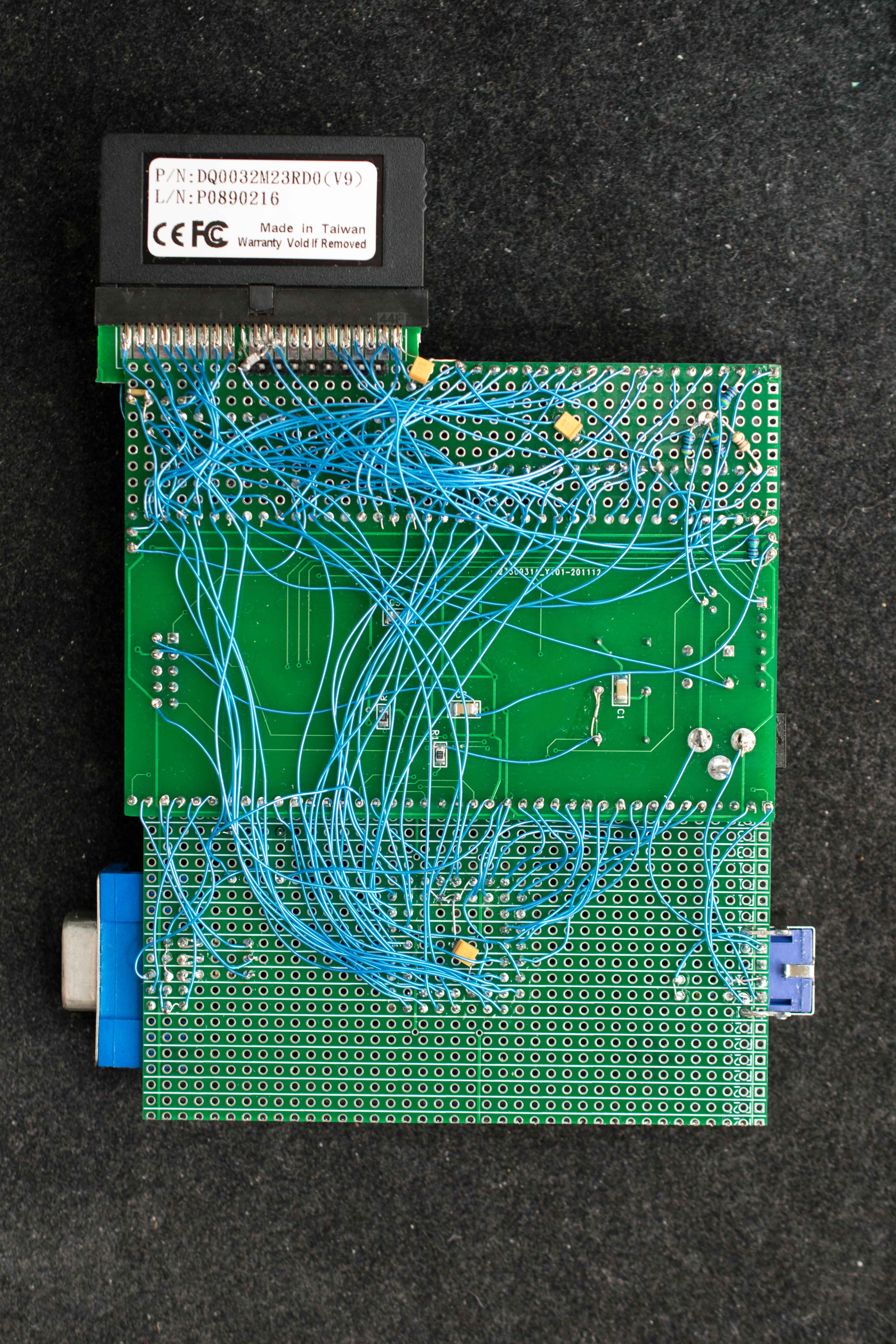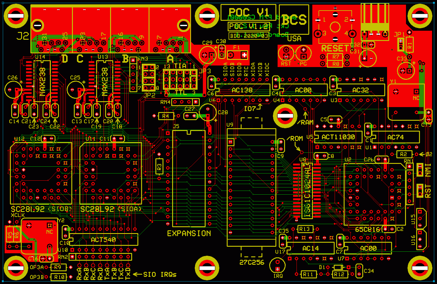 Red traces are on top and green on the bottom. This is actually a four-layer board, and is stable at 20 MHz. It was the last unit I built with PDIP logic devices.