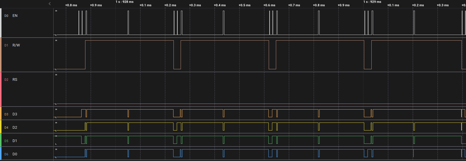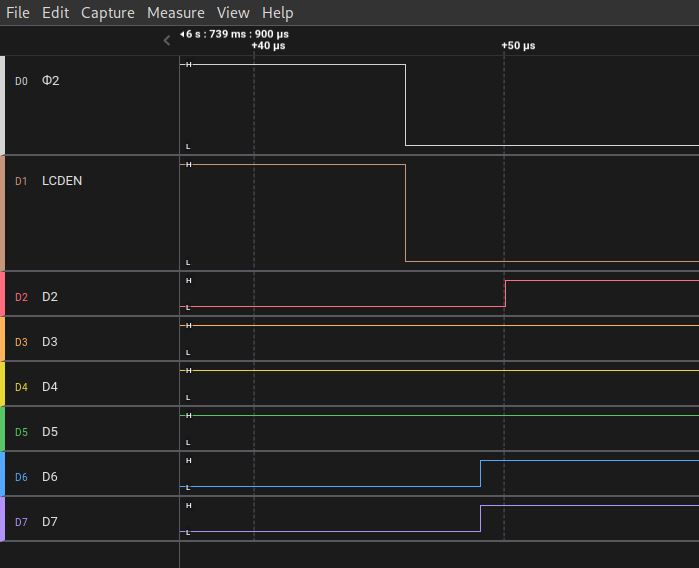 Here's "lda #%00111000; sta LCD0" (captured at 1KHz): (You can see 6 high bits of 00111000 - "8 bit, 2 lines, 5x8" initialization, and LCDEN correctly falls with Ф2.)