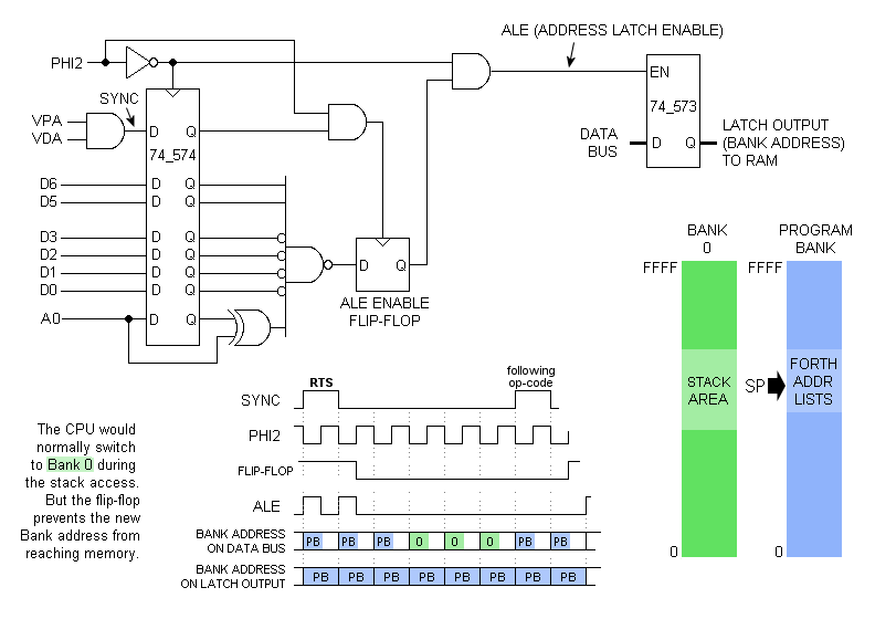 By using two banks we've provided two separate storage areas, as required. Normally RTS would be unable to access the address list, due to the CPU's policy of steering all stack-related operations to Bank 0. RTS will cause the CPU to do a pull, but it would normally be from Bank 0. To correct this, the circuit above detects RTS opcodes and forces the resulting "stack" memory accesses to remain in the Program Bank instead of going to Bank 0.