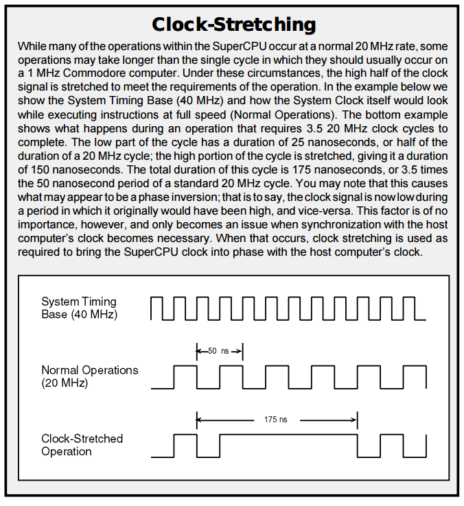 There's a pdf here about a RAM expansion which goes into a little detail about clock-stretching on the SuperCPU (it's a 20MHz CPU on a 1MHz machine, so something must be done for off-board devices!)
