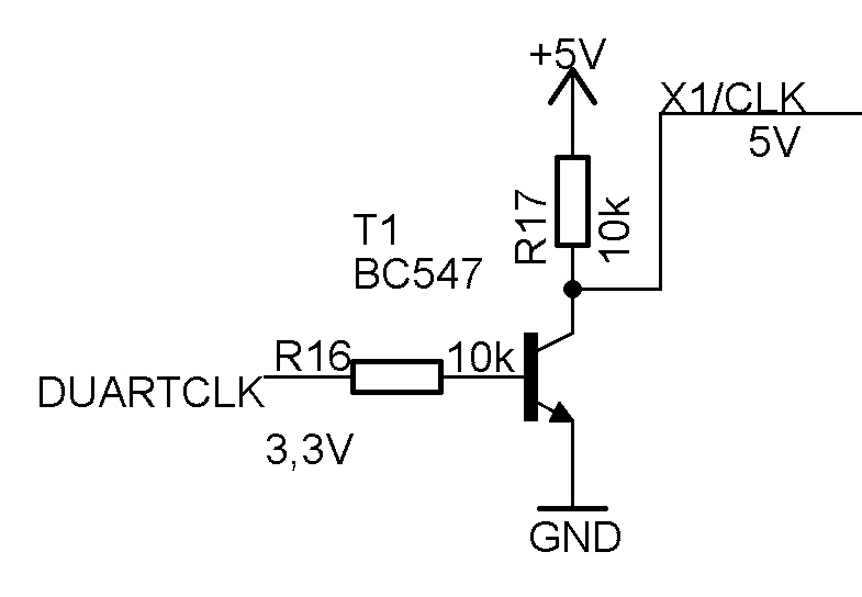For MARC-2 I’m using an XC95288XL 144 pin CPLD. It’s a 3,3V part with 5V tolerant I/O’s. The DUART that I’m using, the SC26C92, needs 0,8 x 5V = 4V at the clock input. I want the CPLD to deliver that clock and level-shift it to 5V. I could use a resister to pull-up to 5V and tri-state the I/O line for HIGH. This is a method Xilinx suggests. I’d rather use a transistor like this...
