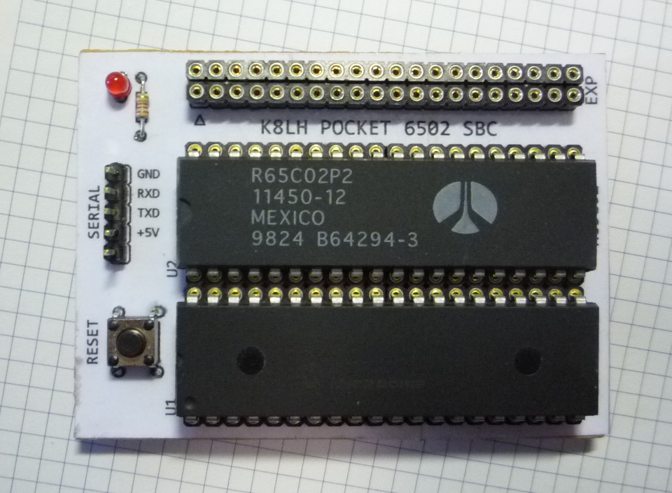 This is basically a ROM-less SBC with an R65C02 CPU running at 1-MHz, a 64K RAM chip, and a PIC microcontroller "helper". The PIC provides the 6502 reset and 1-MHz clock signals and it loads RAM during power-up or after a reset with a pseudo ROM image from flash memory. The PIC also eliminates the need for a GAL or other discrete logic ICs for address decoding by implementing a soft decoder with single page resolution for up to six chip select pins. The soft decoder also maps the PIC UART to a single page in 6502 address space and the UART presents to the 6502 as a simple 6850 ACIA.