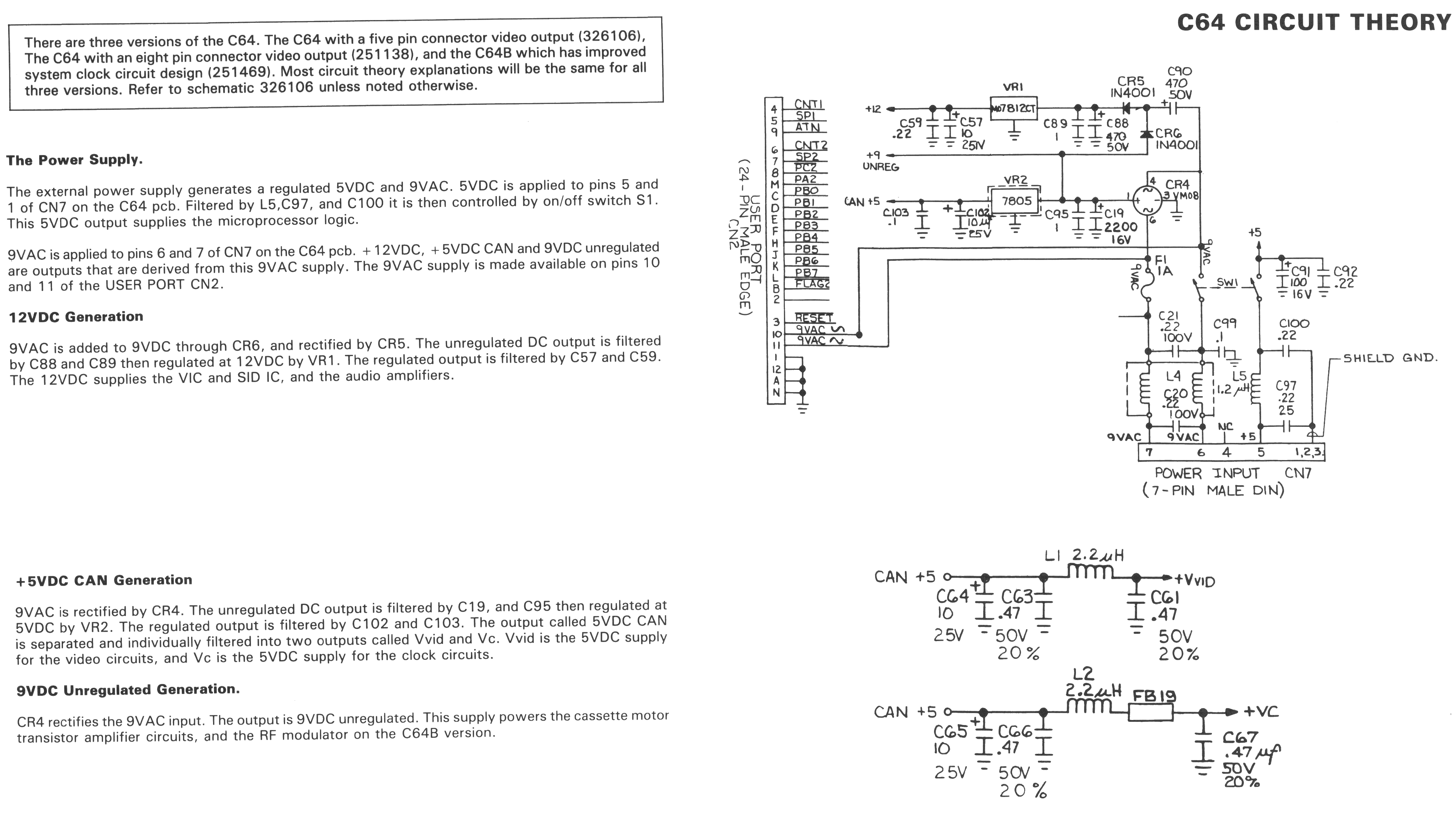 Thanks for taking the time to find and post the schematic in the previous post for the C64 power circuits. Those schematics and the accompanying description are certainly much better. I will have to file away for a future project the simple AC boost circuit included that is used to provide the power to the +12Vdc linear regulator.