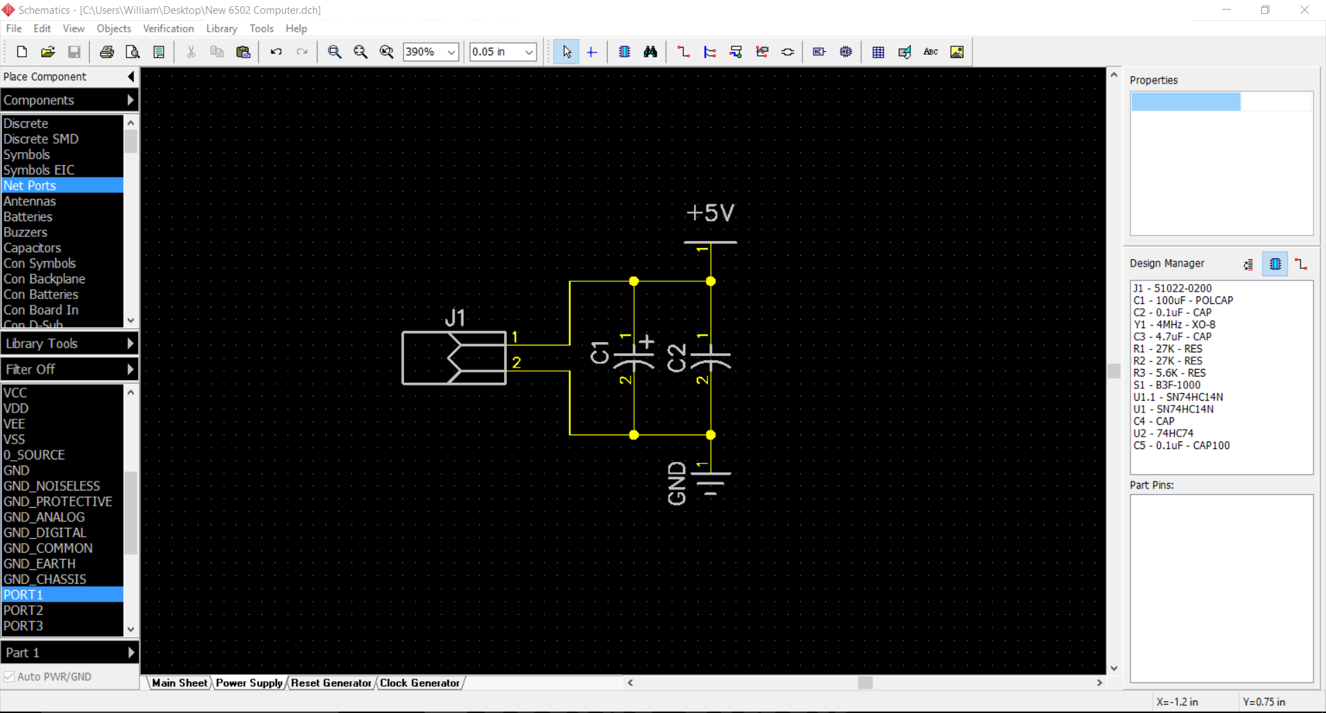 I have finally settled on DipTrace as my schematic editor and have reworked the power supply, clock generator, and reset generator.