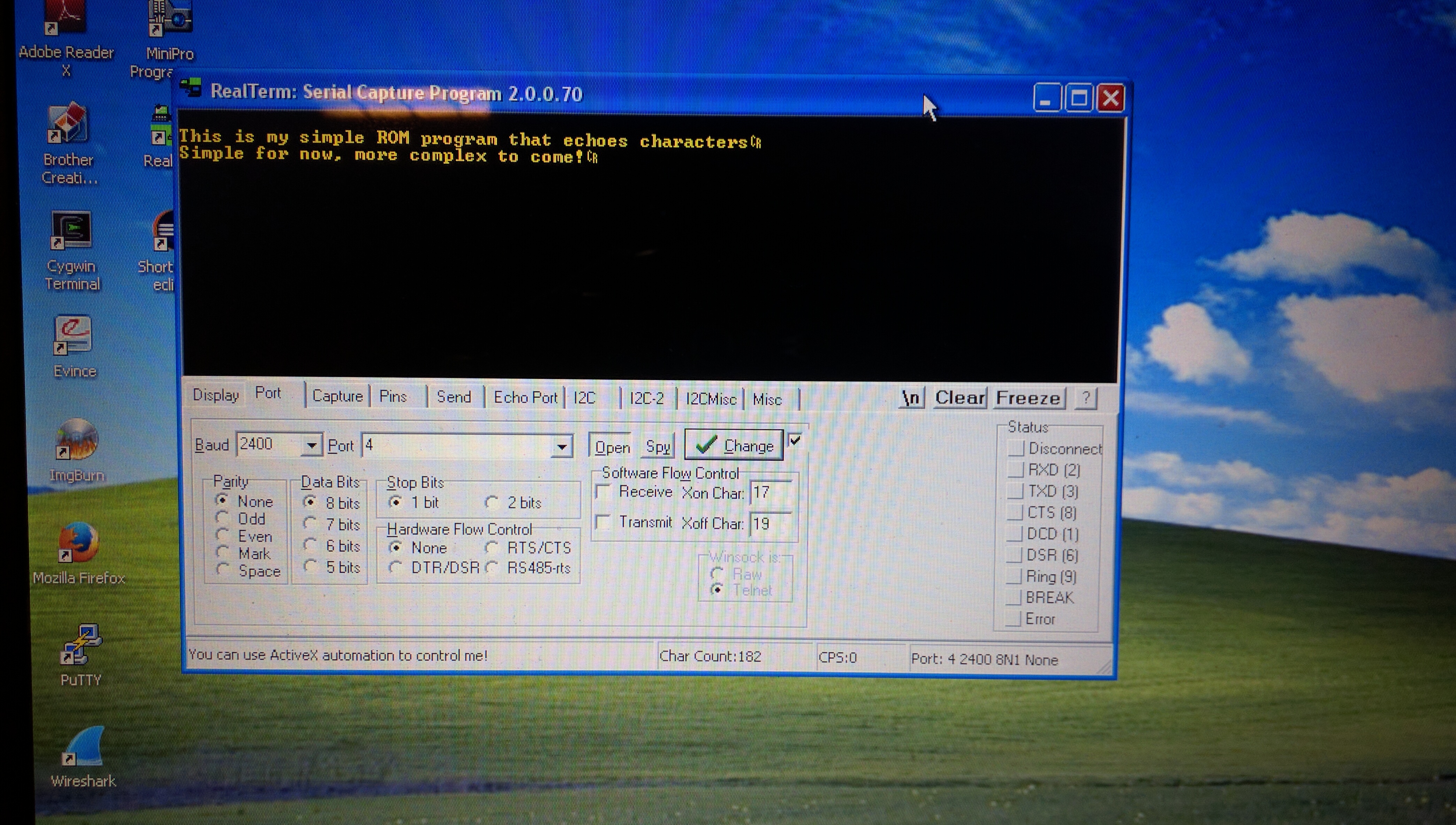 I finally bought an oscilloscope about a month ago and started building up the breadboard again. A scope is an invaluable tool...I never would have been able to debug without it! I've learned a lot, both on my own and from the people I've spoken to on these forums. It was quite an amazing feeling to finally get characters echoed back to me after I typed them in the terminal.