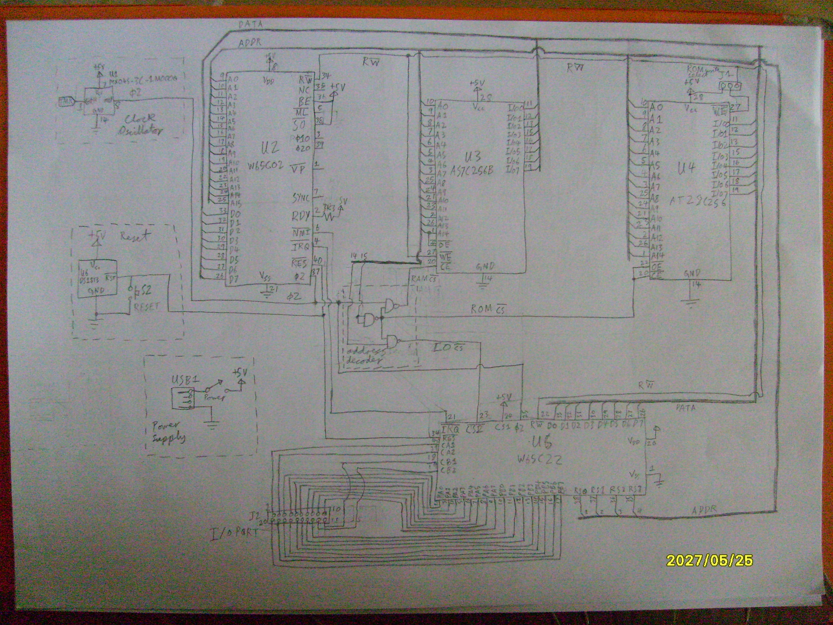 (There are two resistors per line so you don't cause severe bus contention if you accidentally pull one or more lines down when one of the ICs is trying to pull them up.) The ROM's OE\ may need similar attention when you take care of the comment above. When the computer is running, all switches should be open (except maybe the ROM's OE\, depending on how you take care of it). To program the EEPROM, flip the switch to pull BE down, set the switches for the desired address and data, and push the button to pull the R/W\ line down momentarily. With BE pulled low, ie, negated, you can even let the processor's clock run, and it won't matter, so you can remove the logic in the clock line too. Now you don't need buffers between the switches and the buses, and the other logic becomes simpler too. If the LED drivers have CMOS inputs, you don't need latches before them either. The LEDs will show the address and data.