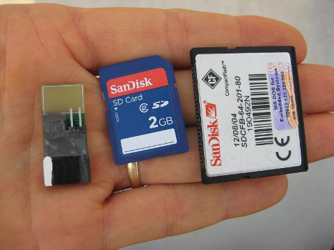My own first application for SPI-10 is 4MB flash memories that come in a wide SO-8 package about 0.2"x0.3". Here's one of my home-made modules, and to the right, a standard SD card and a CompactFlash card. On the SPI-10 module, pin 1 is marked by a white stripe (I used white-out), and the two-pin 90° header is to put a jumper on for write-protect. 40% of the board is just there as a handle to unplug it, and/or to have a small space to label what you have stored on the module. You can make your own file system, or even use the module without any file system at all.