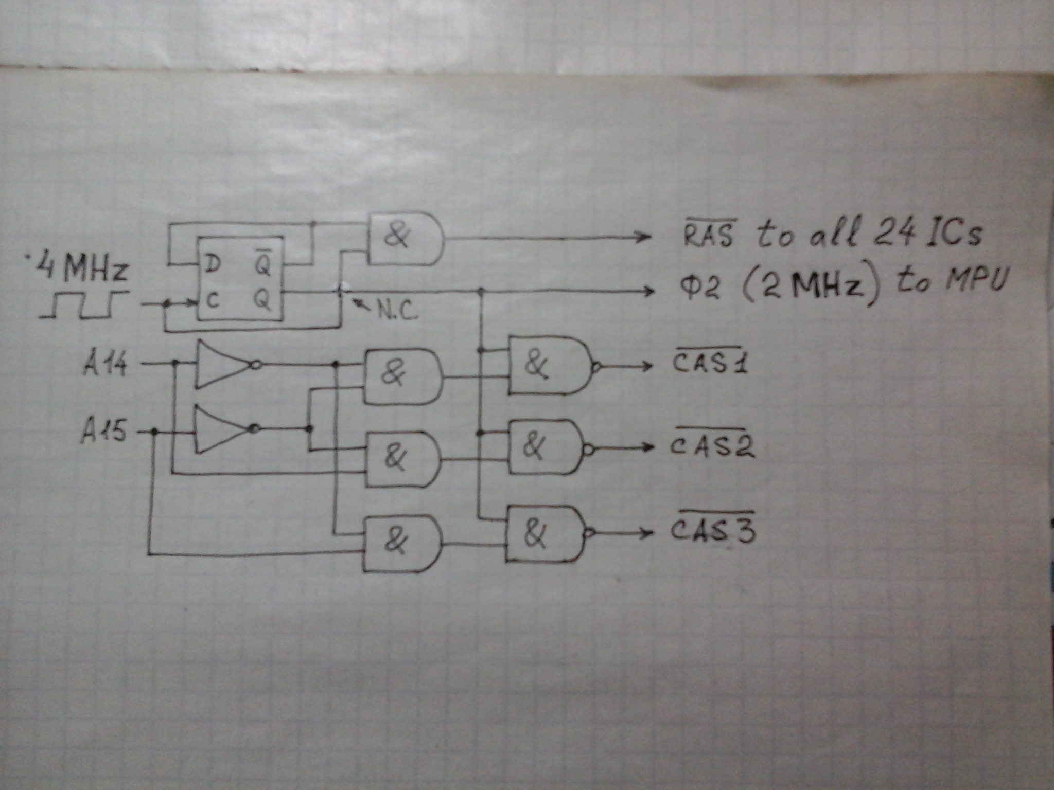 May be this should control DRAM...? Multiplexers (not pictured) should be switched by /RAS. R/W signal from MPU is connected direct to /W of all DRAMs. Address decoder included :wink: