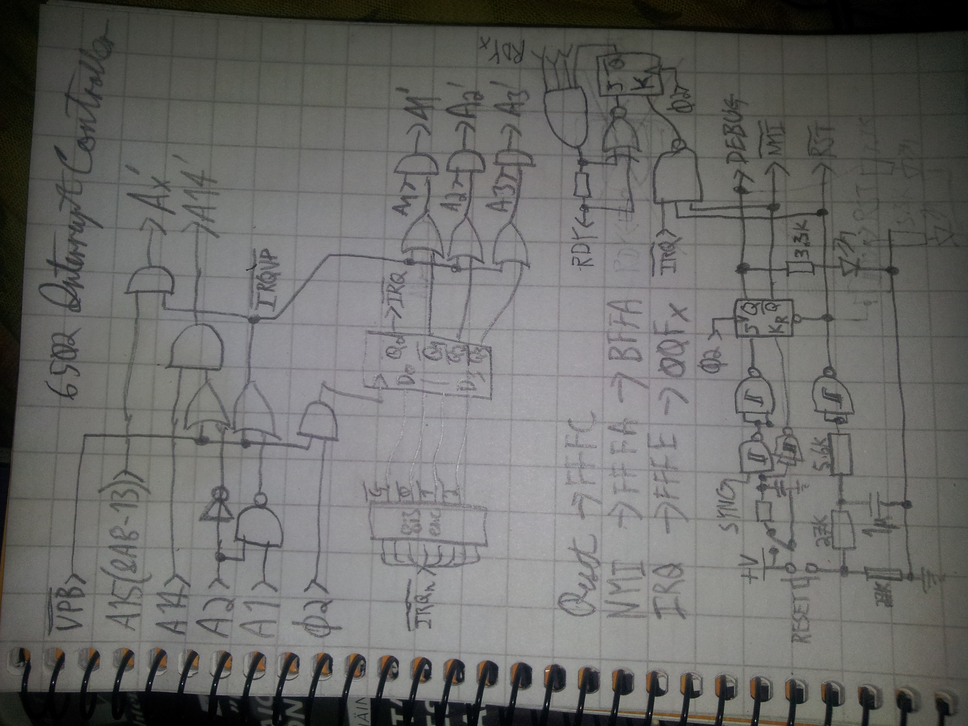 Meanwhile, I've got a notebook page covered liberally with more details of the control circuitry I'll need to correctly sequence /NMI with /RESET on power-up with the debug switch set, and to correctly implement wait-state signals without incurring a power drain when the CPU executes WAI and pulls RDY low itself - which is, of course, when you most want to *save* power in a battery-powered machine. The combination of these two functions uses a pair of JK flipflops and all of a quad Schmitt-triggered NAND chip.
