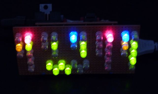 The time is counted on LEDs like an Abacus calculator. To match the 60 minutes / 24 (12) hours of how we count time, digits have different numbering schemes.