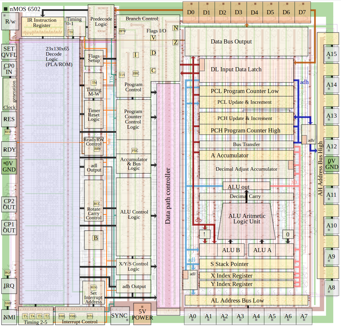 I have tried to lay out the circuit much like the original chip (with Hanson orientation, i.e., PLA on the left, data path on the right) but circuit diagrams and silicon chips have somewhat different constraints, so many compromises were necessary. Nevertheless I found the iconic layout of the 6502 quite inspirational for drawing this circuit diagram. My diagram likely contains many errors, as I found many along the process of creating it. Some of these errors are deliberate (e.g. using the same circuit for both halves of the decimal half carry which the 6502 does not). However, modulo these issues, I would like to think my diagram is still 99.9% faithful to the original 6502 circuit, and maybe 95% like the original layout!
